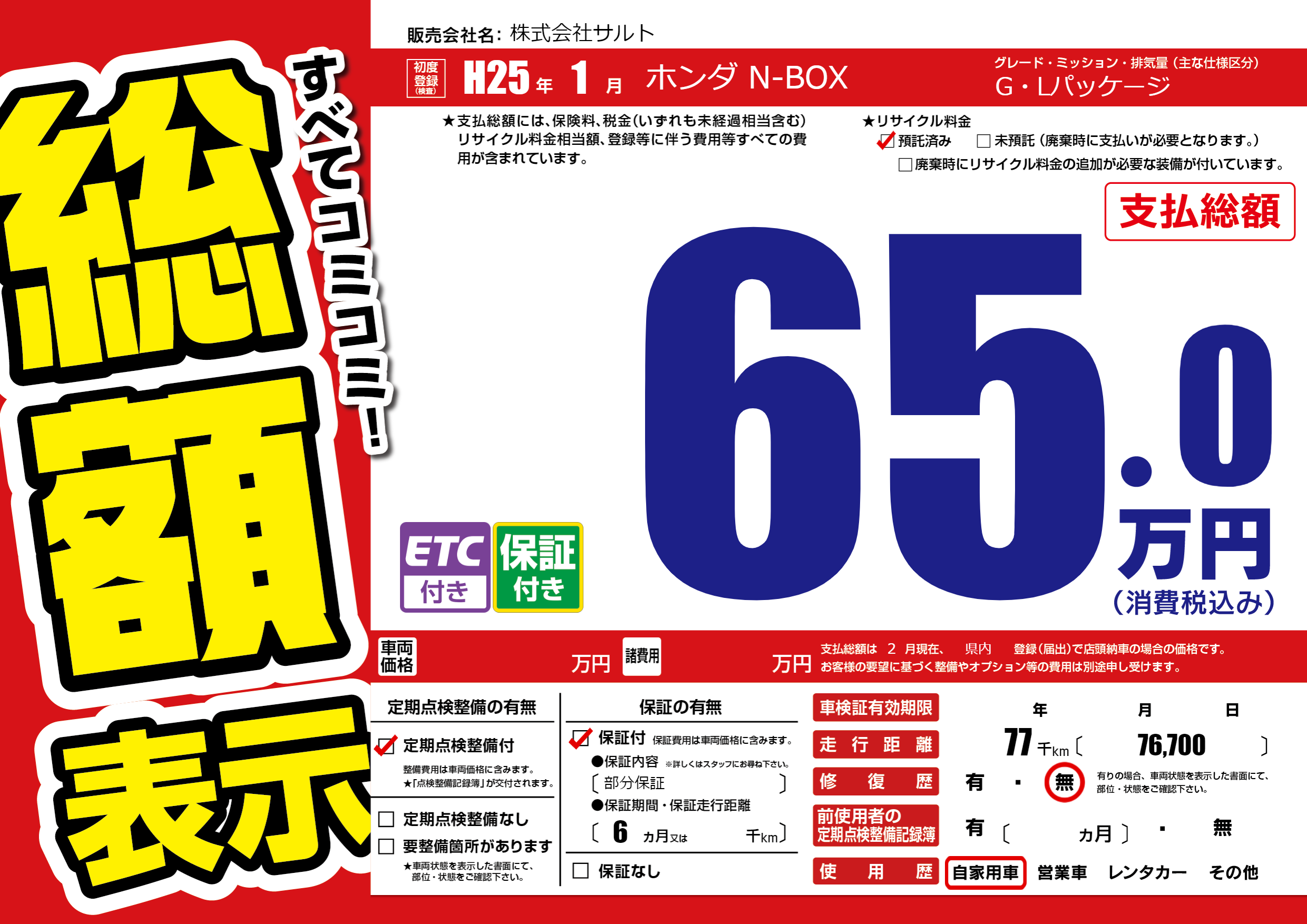| 走行キロ | 7.7万km | 初年度登録 | H25年1月 |