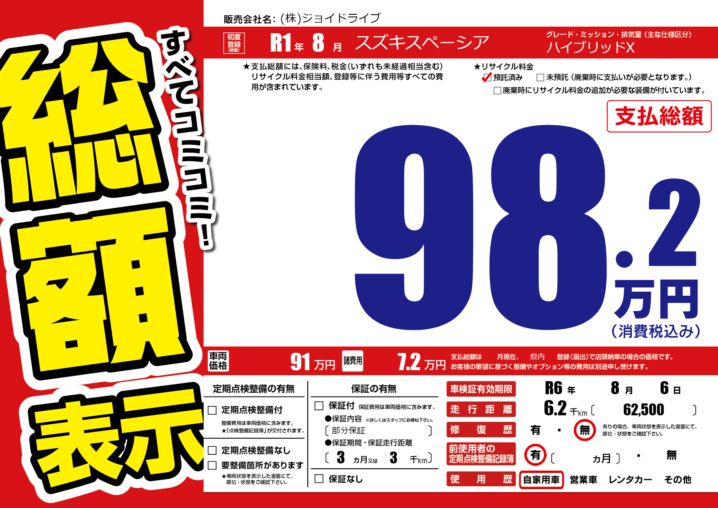 | 車名 | スズキスペーシア | グレード ミッション 排気量 |