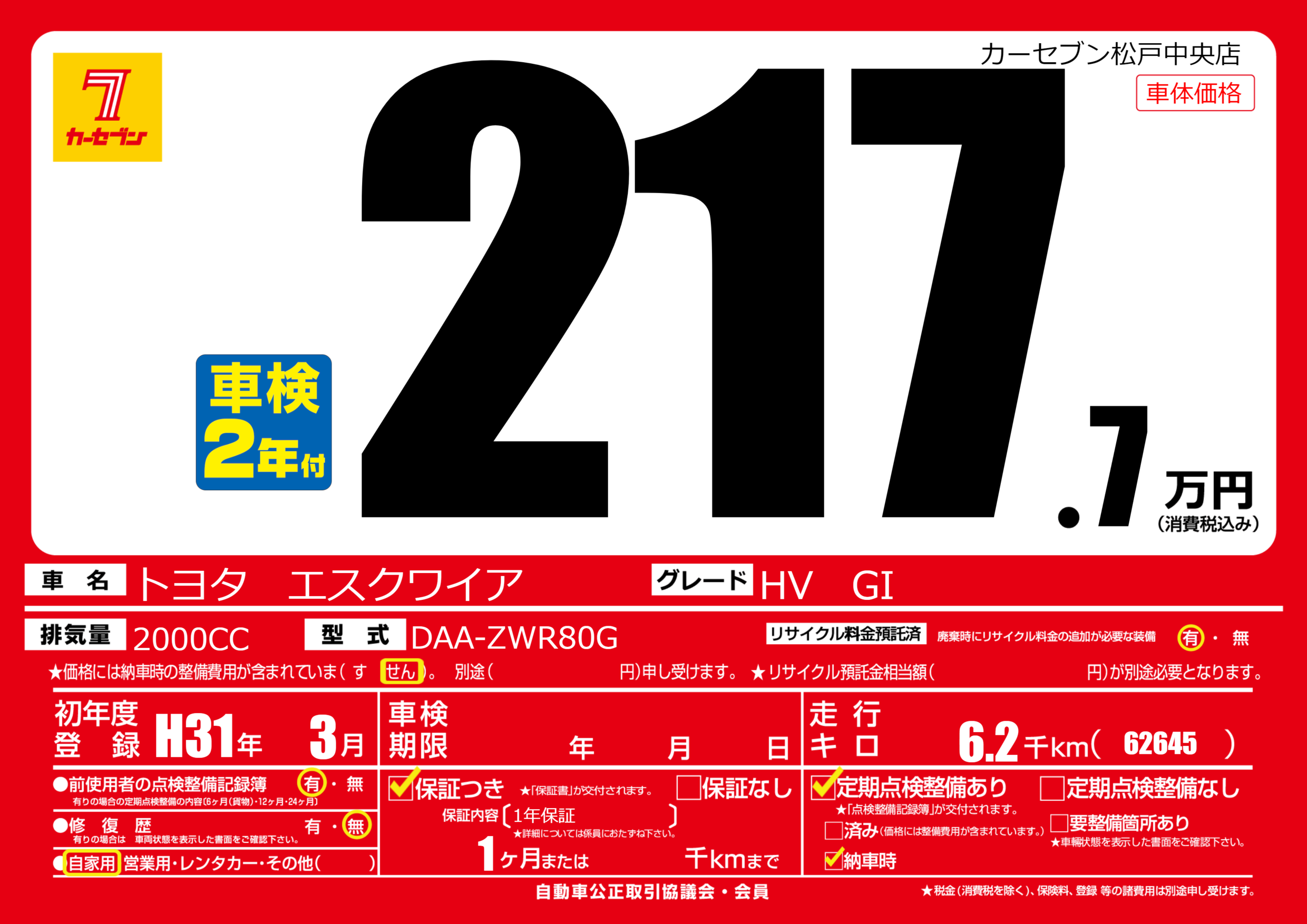 | 走行キロ | 0.6万km | 初年度登録 | H31年3月 |