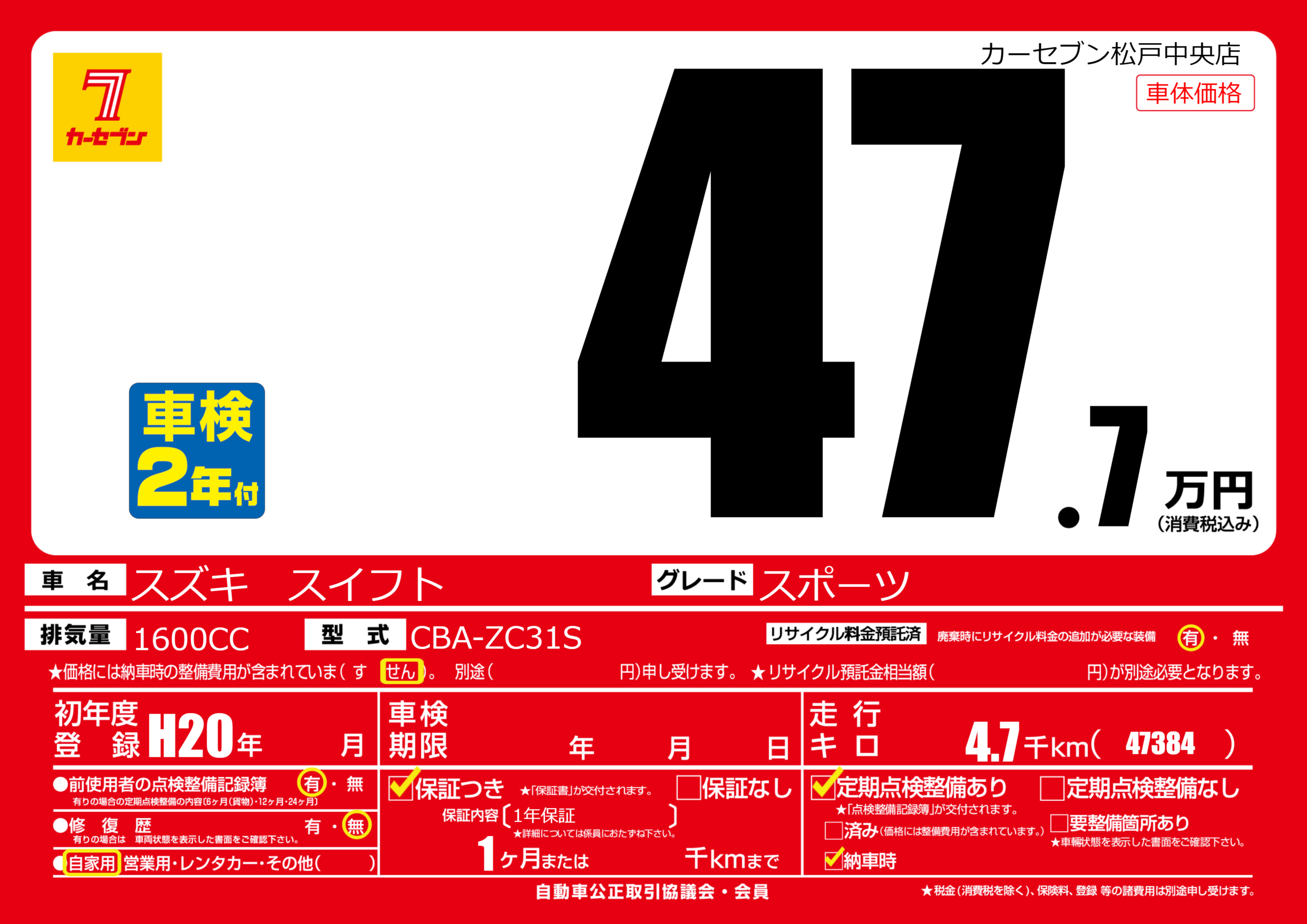 | 車名 | スズキ スイフト | グレード ミッション 排気量 |