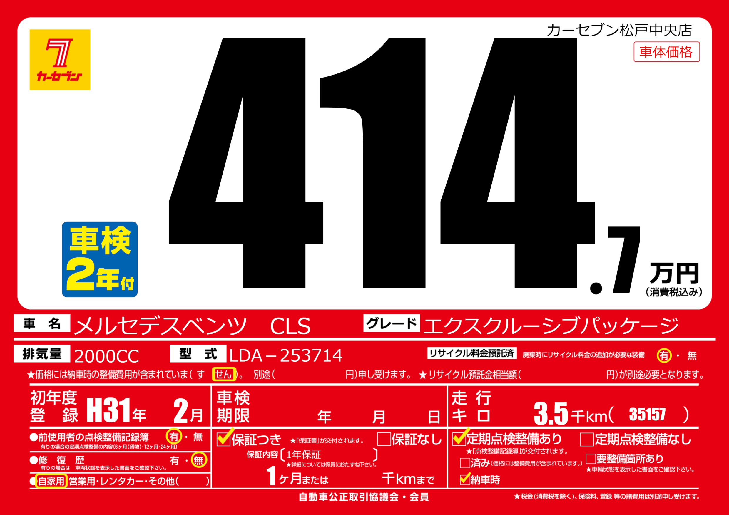 | 車名 | メルセデスベンツ CLS | グレード ミッション 排気量 |