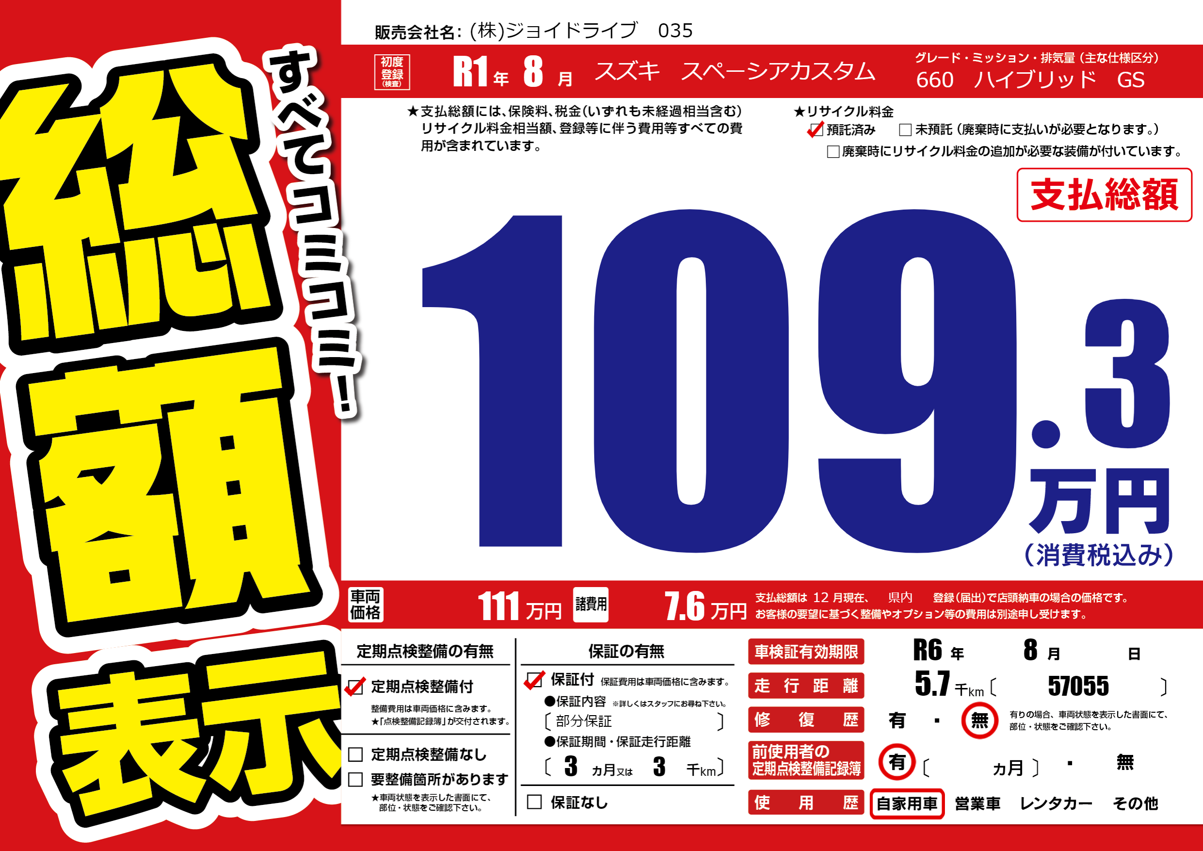 | 車名 | スズキ スペーシアカスタム | グレード ミッション 排気量 |