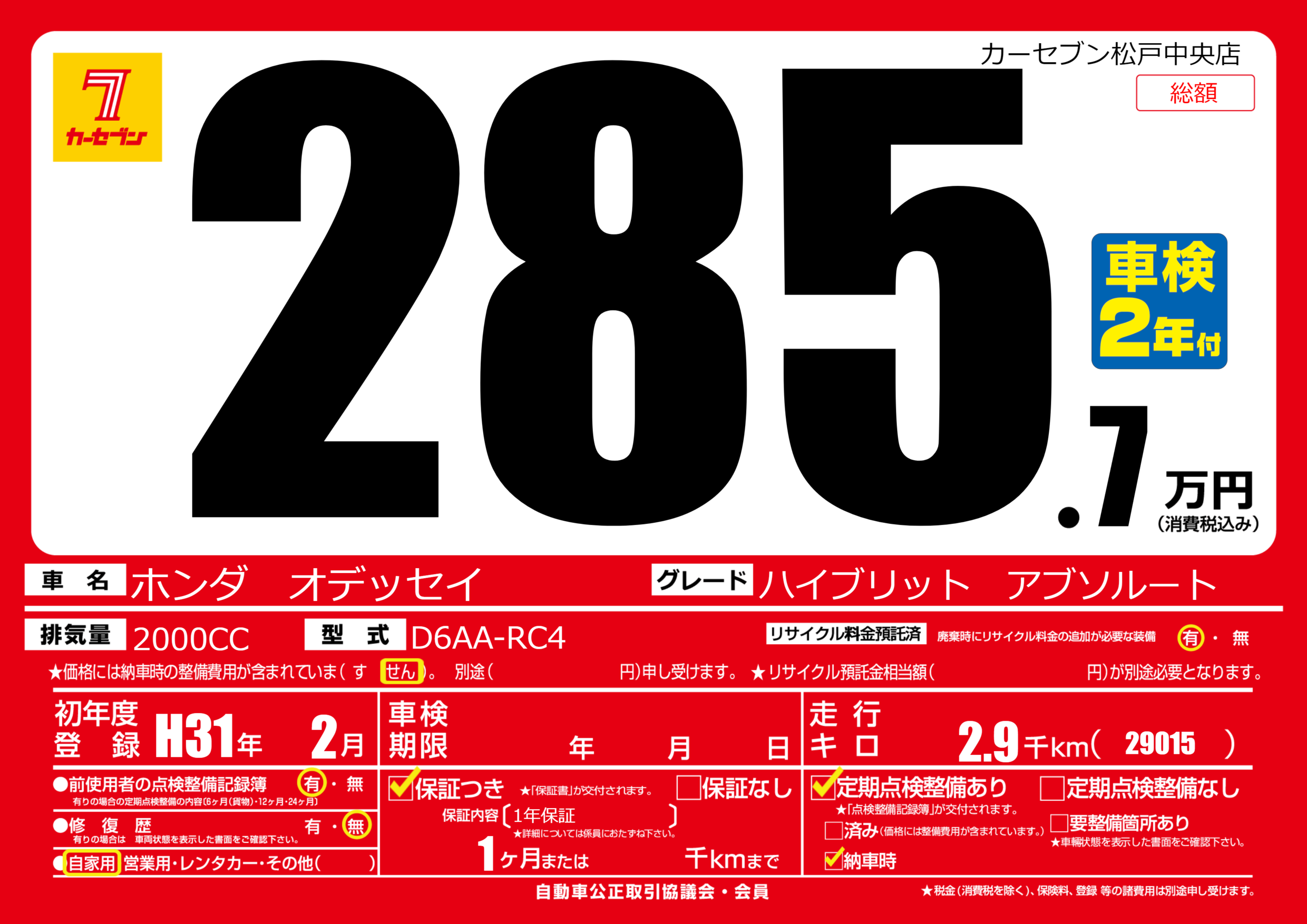 | 走行キロ | 0.2万km | 初年度登録 | H31年2月 |