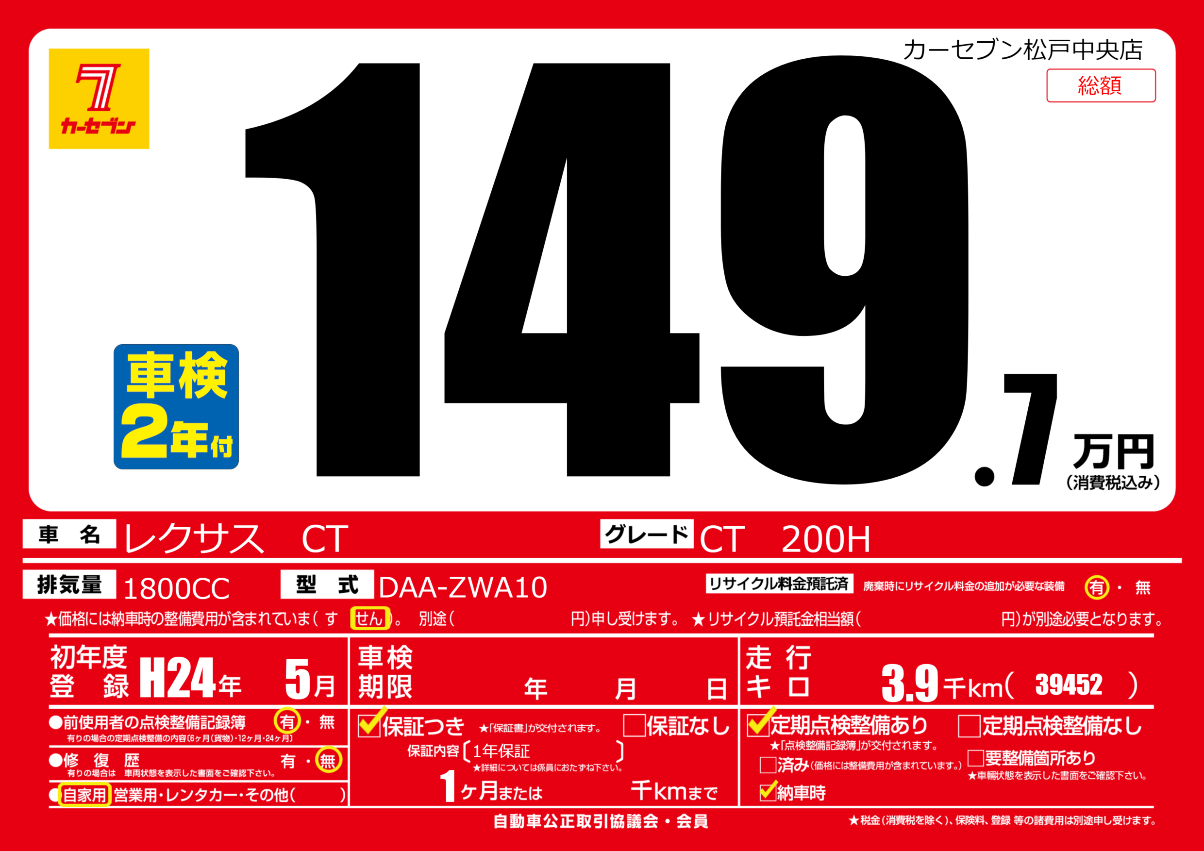 | 車名 | レクサス CT | グレード ミッション 排気量 |