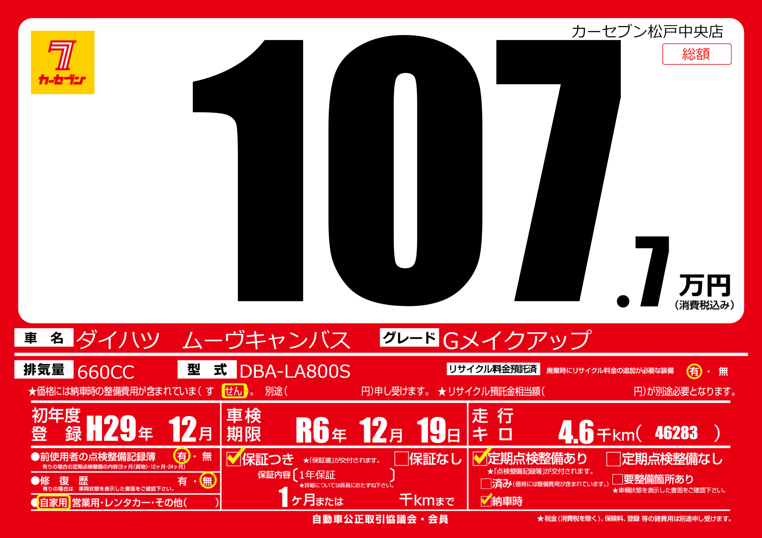 | 車名 | ダイハツ ムーヴキャンバス | グレード ミッション 排気量 |