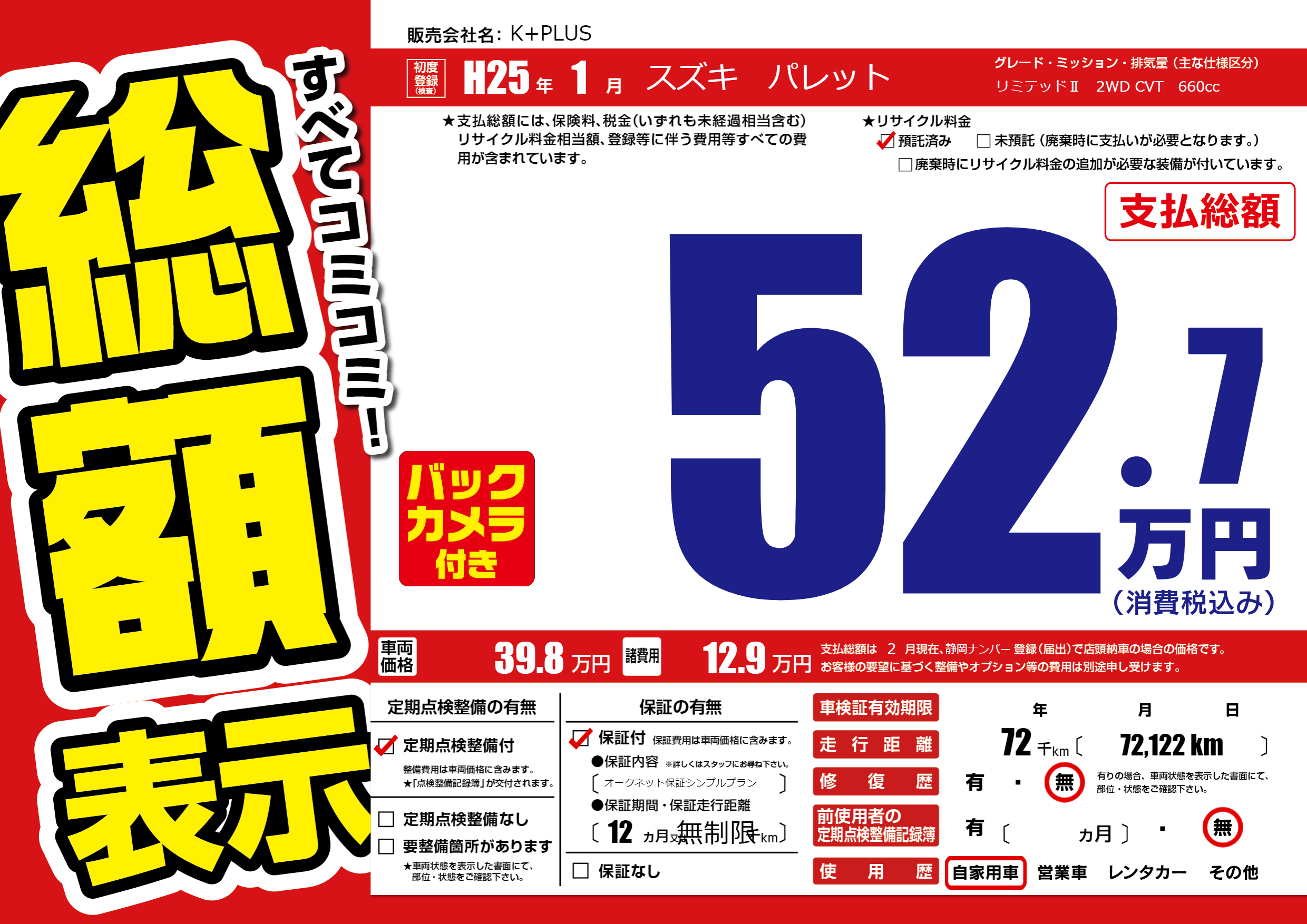 | 車名 | スズキ パレット | グレード ミッション 排気量 |