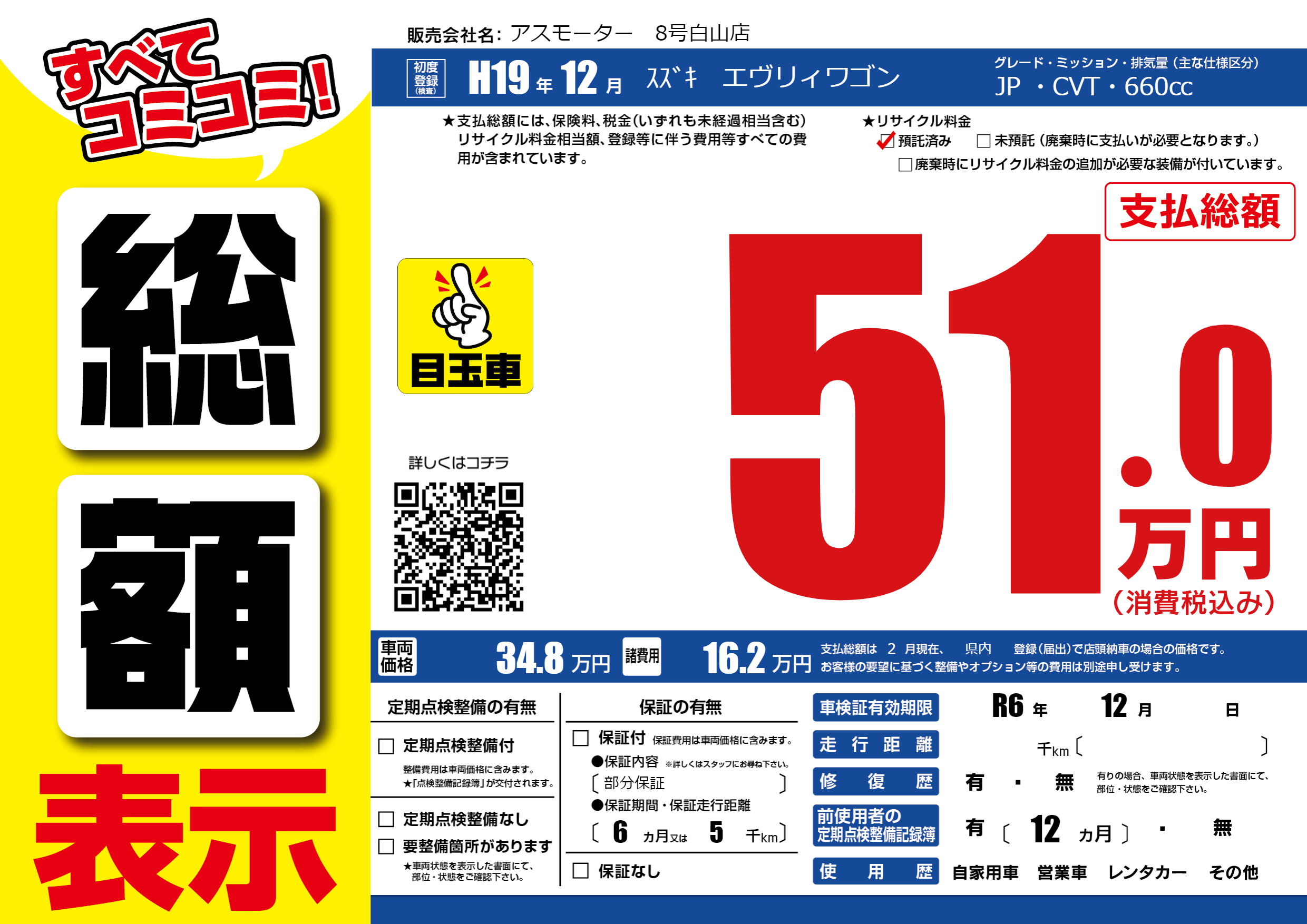 | 車名 | スズキ エヴリィワゴン | グレード ミッション 排気量 |