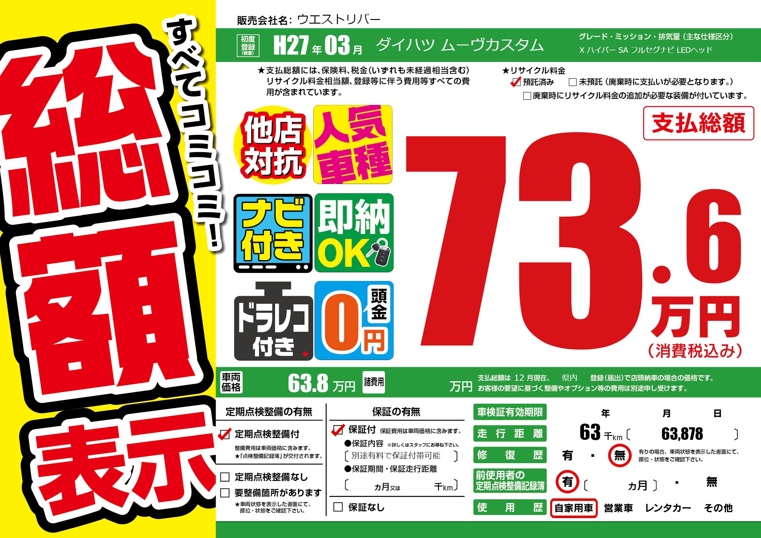 | 走行キロ | 6.3万km | 初年度登録 | H27年03月 |