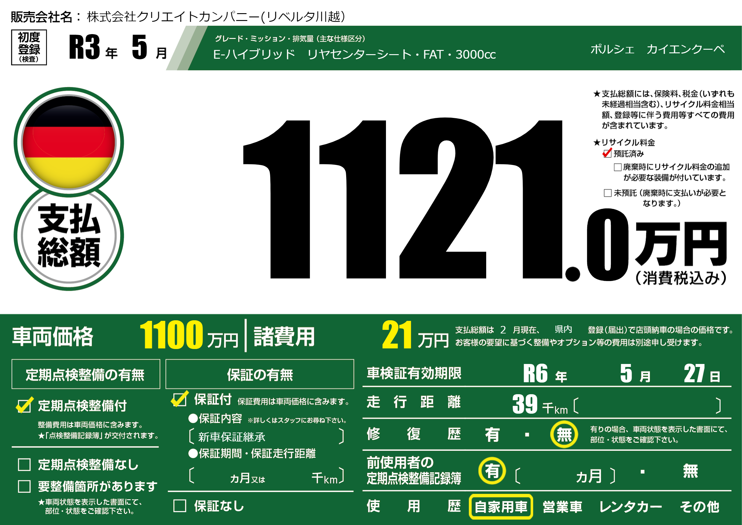 | 走行キロ | 3.9万km | 初年度登録 | R3年5月 |
