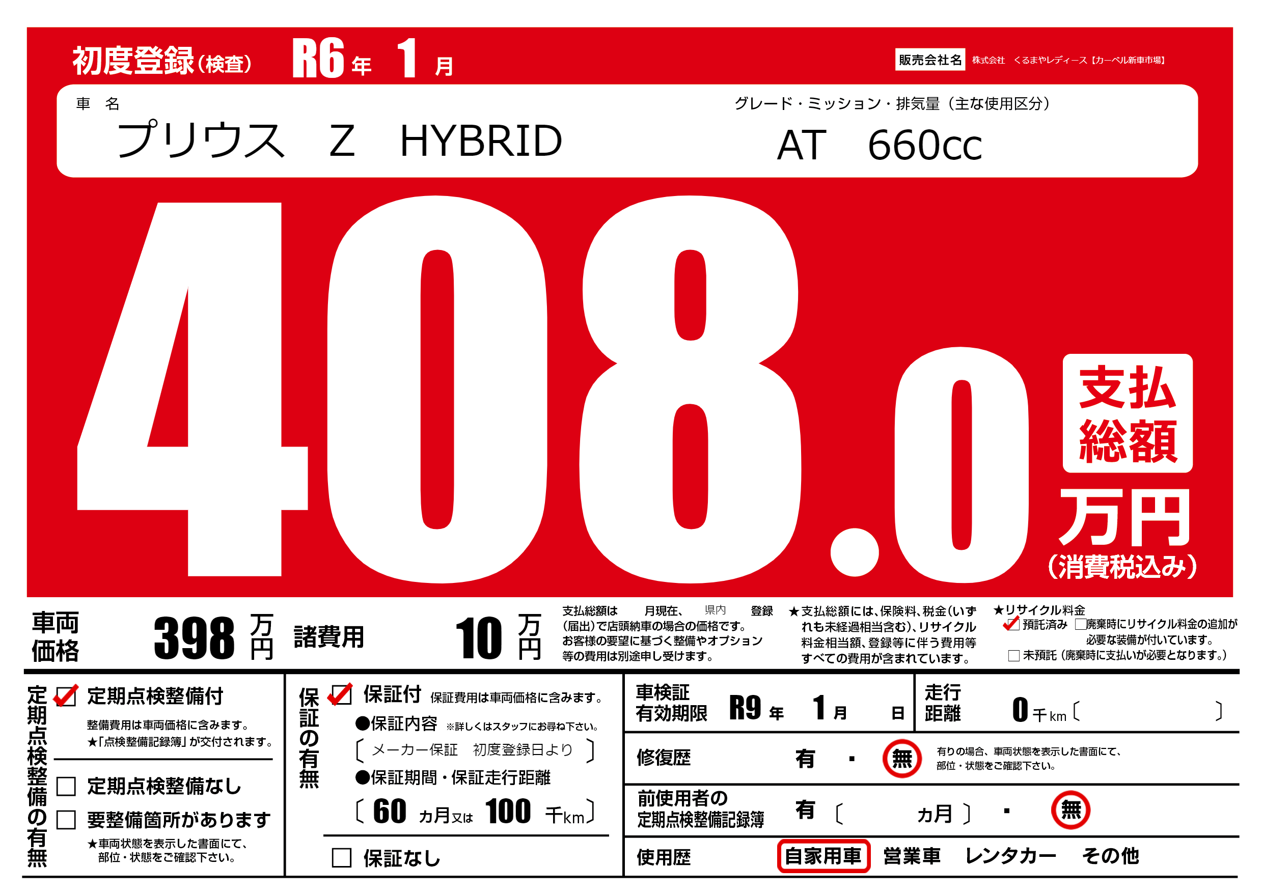 | 車名 | プリウス Z HYBRID | グレード ミッション 排気量 |