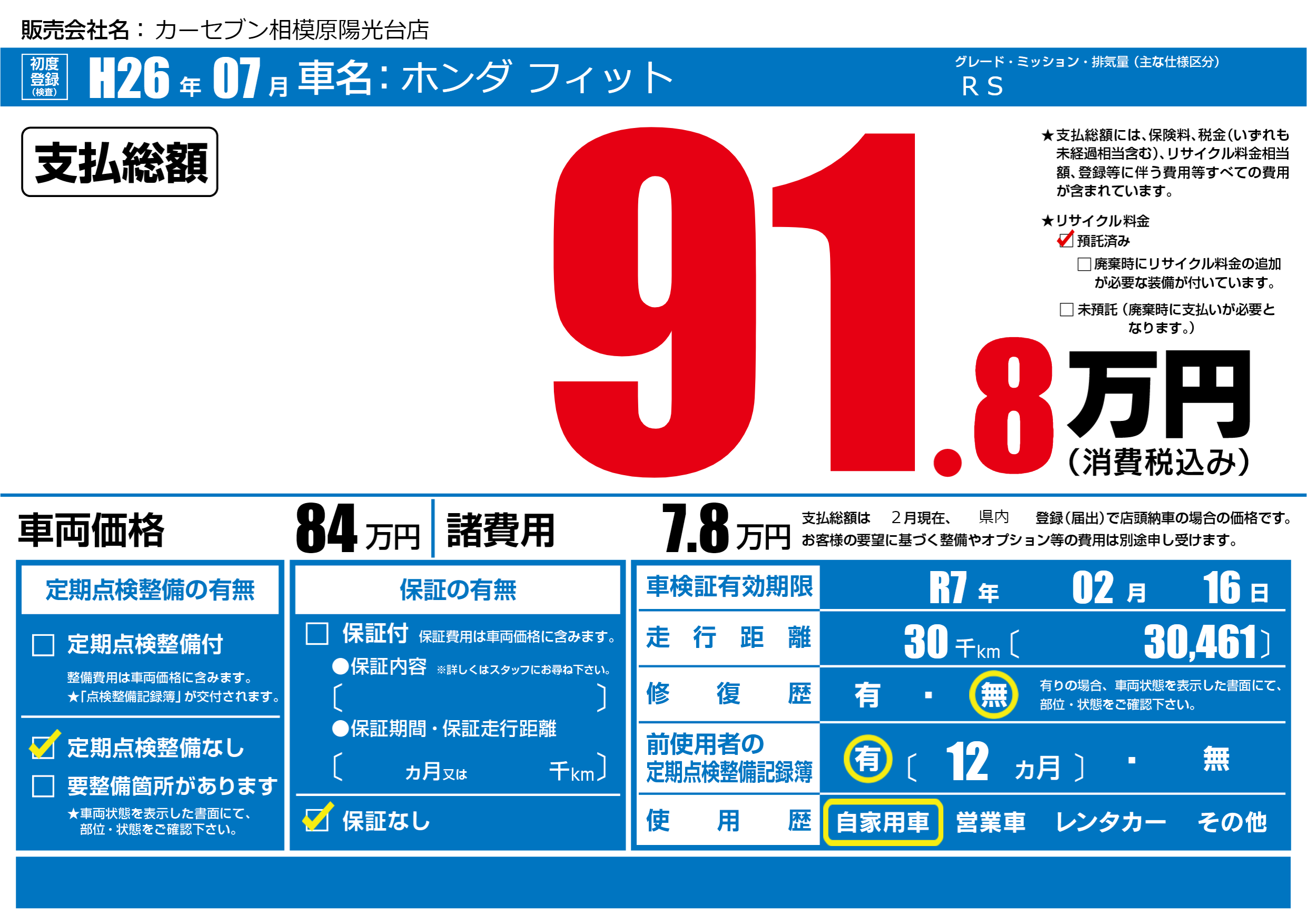 | 走行キロ | 3万km | 初年度登録 | H26年07月 |