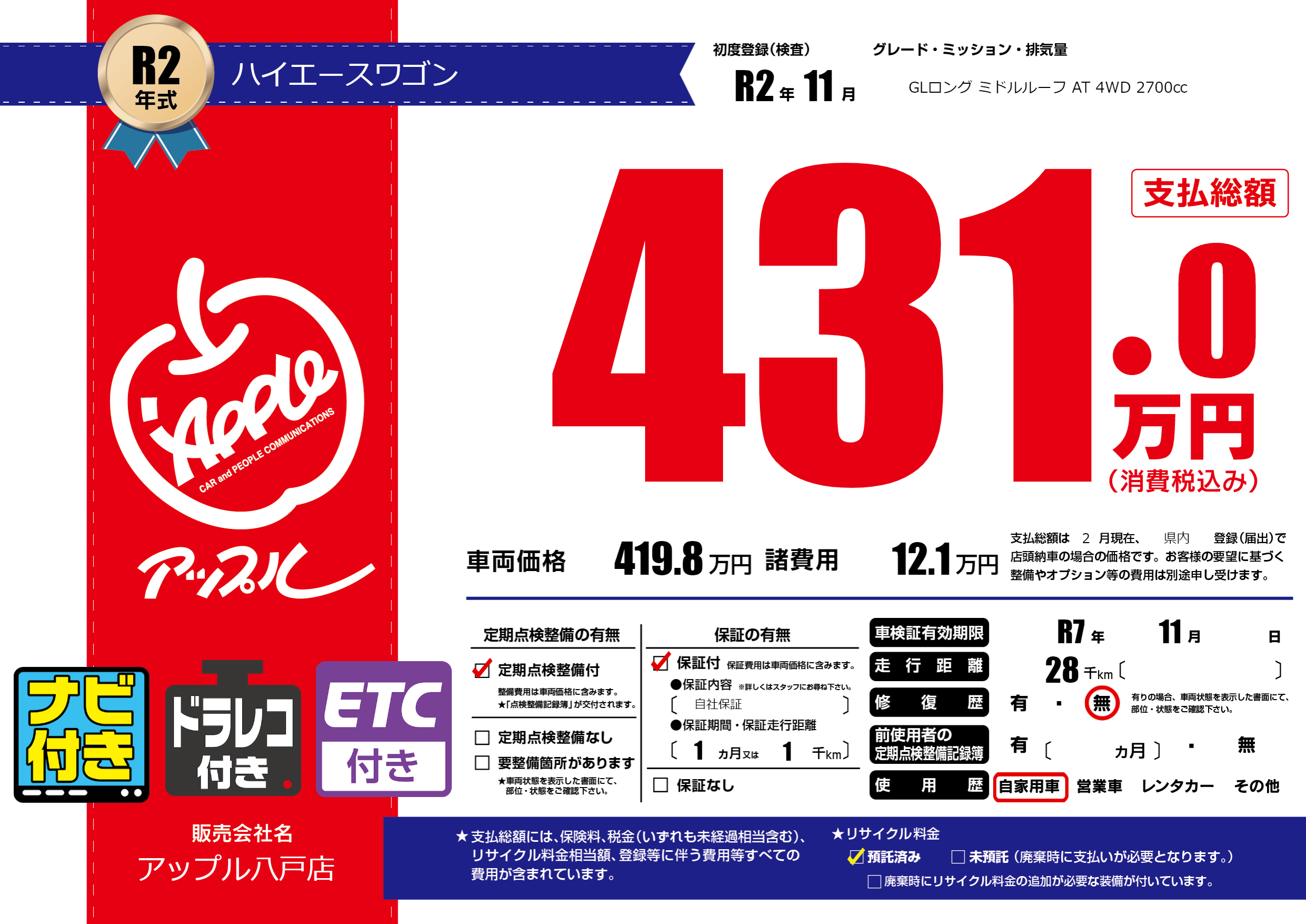 | 車検制限 | R7年 11月 - 日 | ||