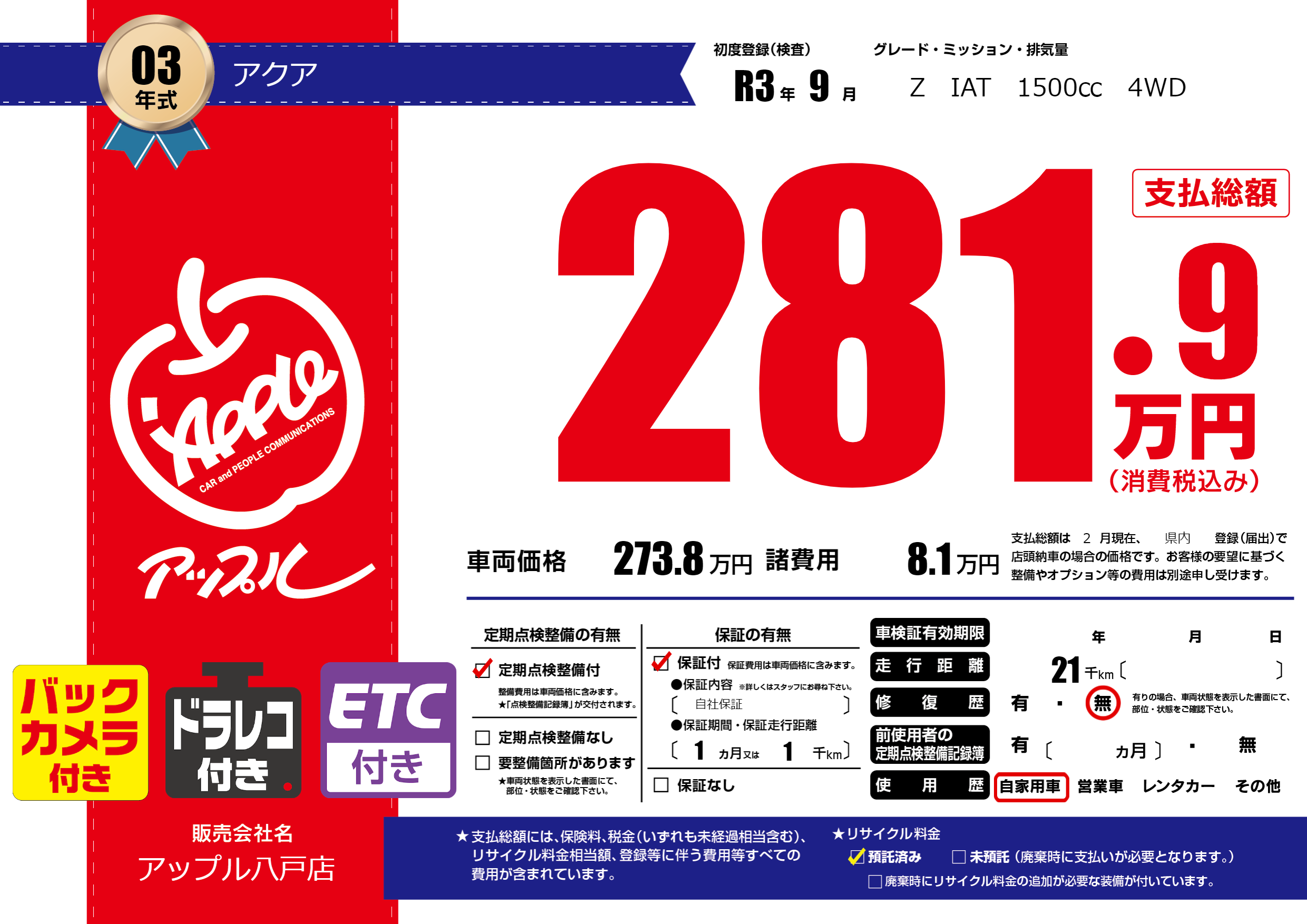 | 走行キロ | 2.1万km | 初年度登録 | R3年9月 |
