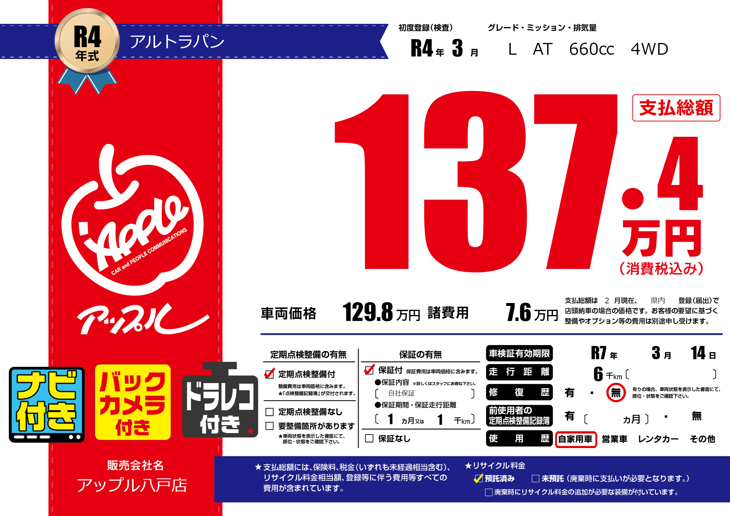 | 走行キロ | 0.6万km | 初年度登録 | R4年3月 |