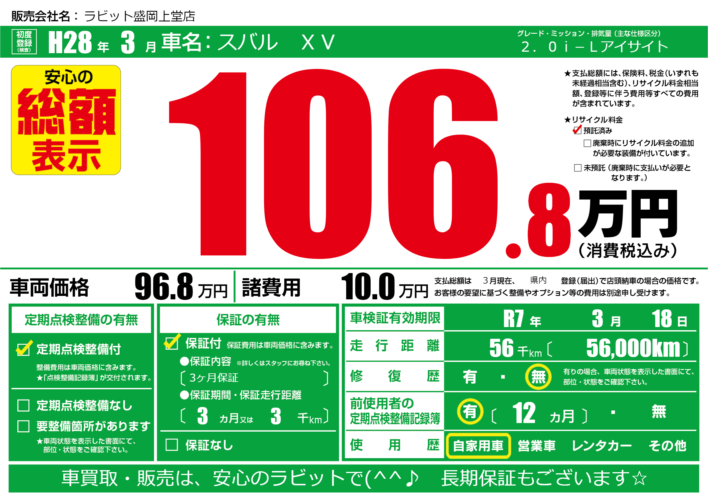 | 車名 | スバル XV | グレード ミッション 排気量 |