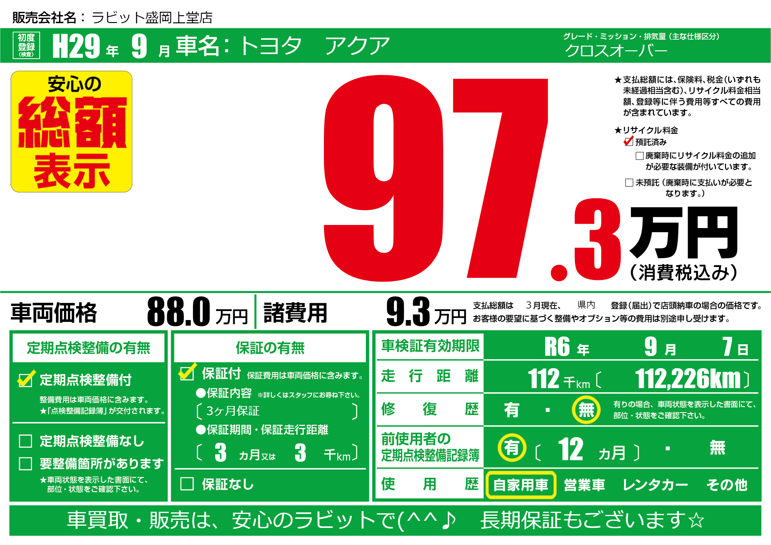 | 車名 | トヨタ アクア | グレード ミッション 排気量 |