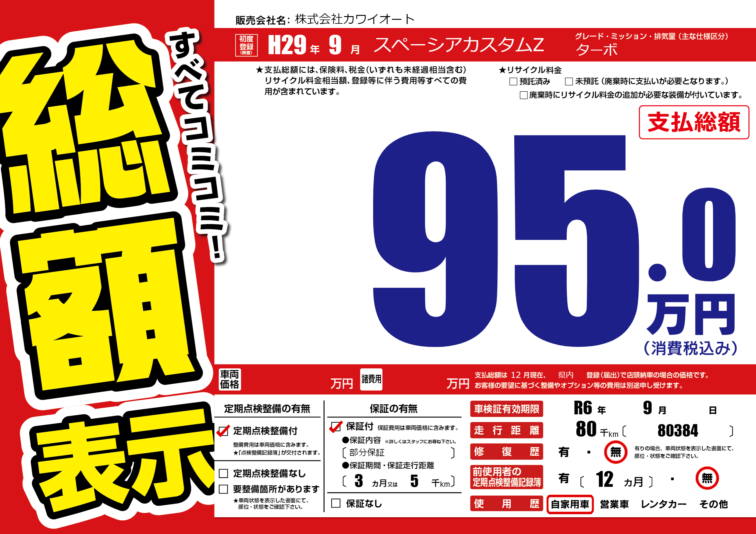 | 走行キロ | 8万km | 初年度登録 | H29年9月 |