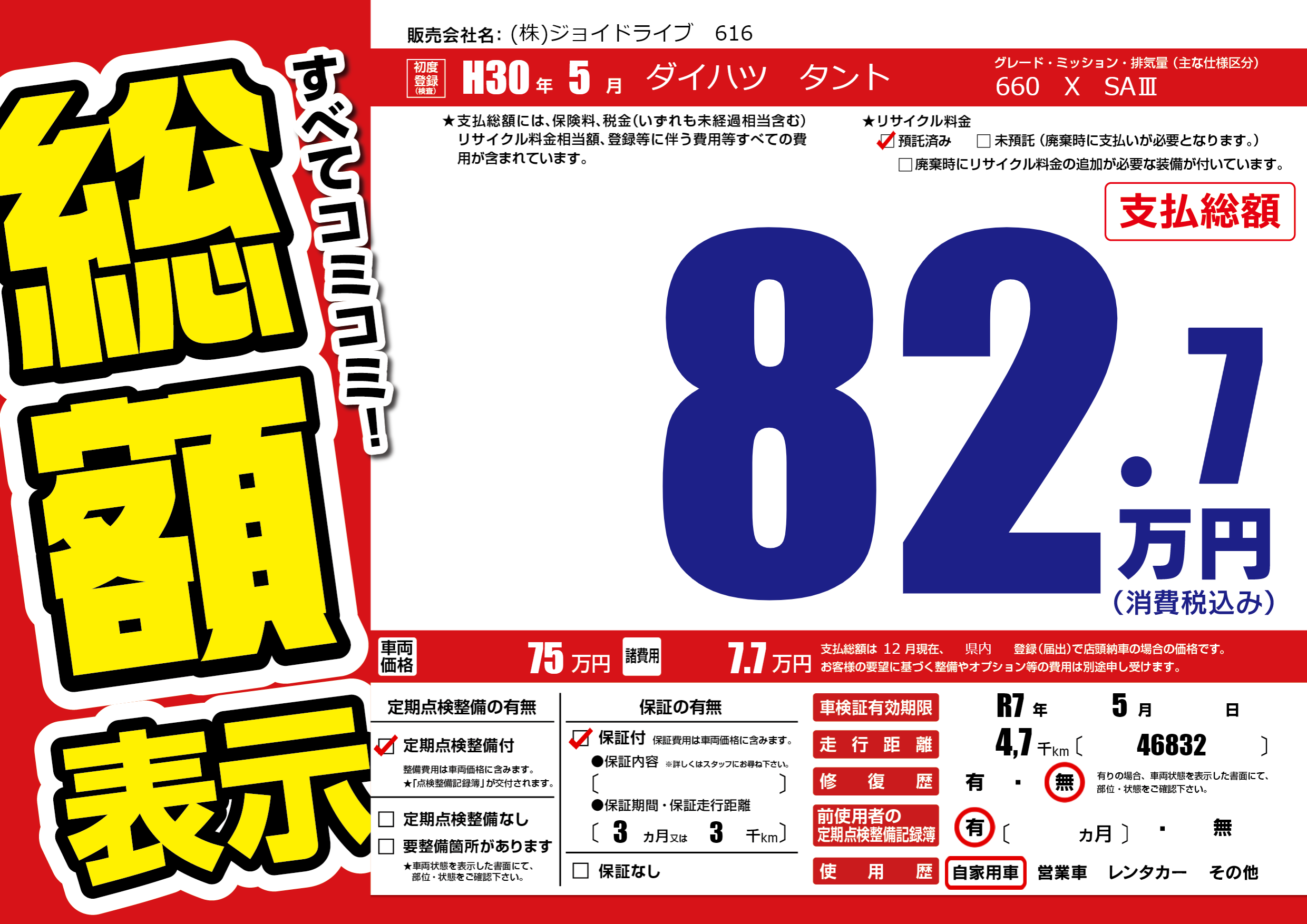 | 車名 | ダイハツ タント | グレード ミッション 排気量 |