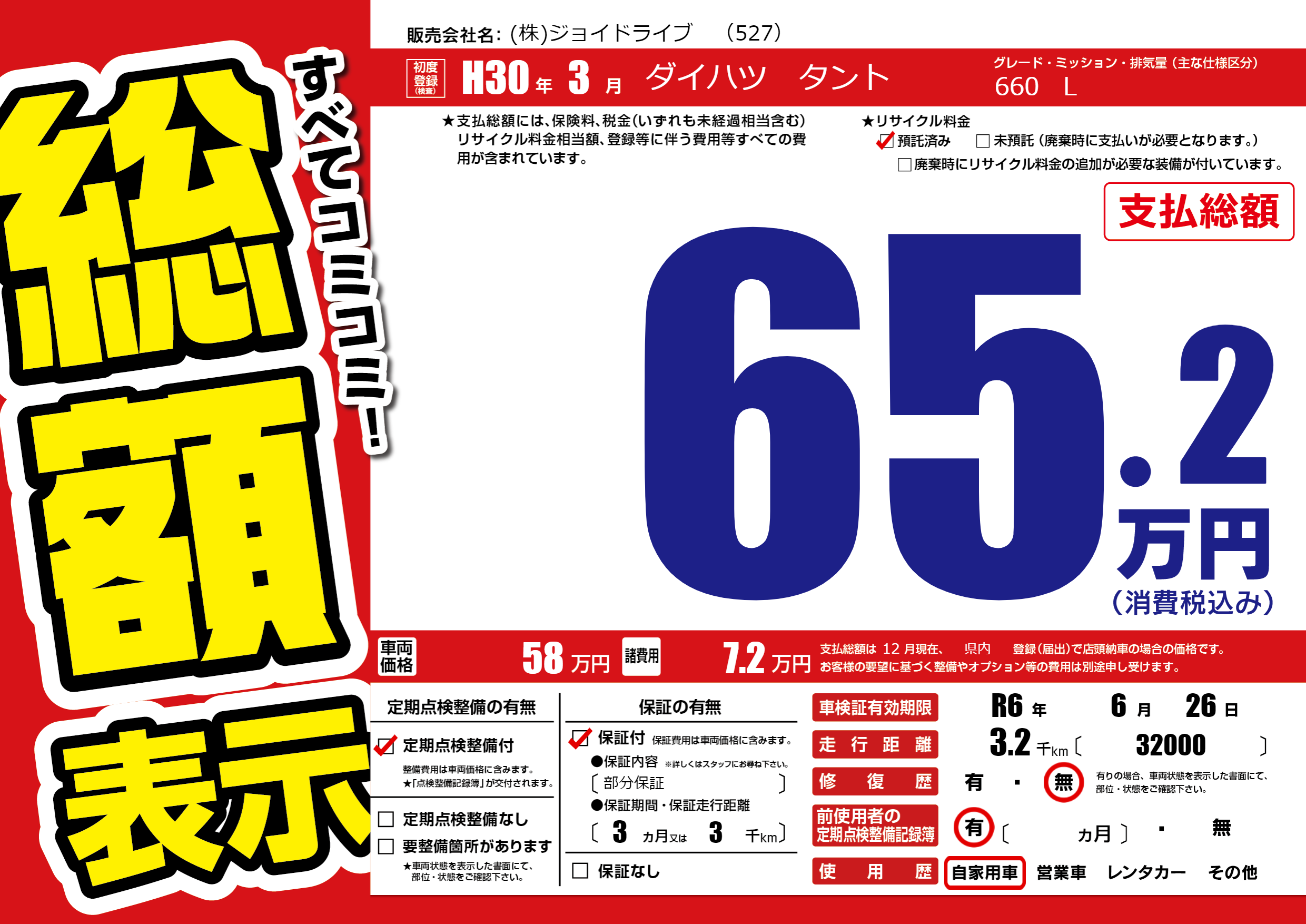 | 車名 | ダイハツ タント | グレード ミッション 排気量 |