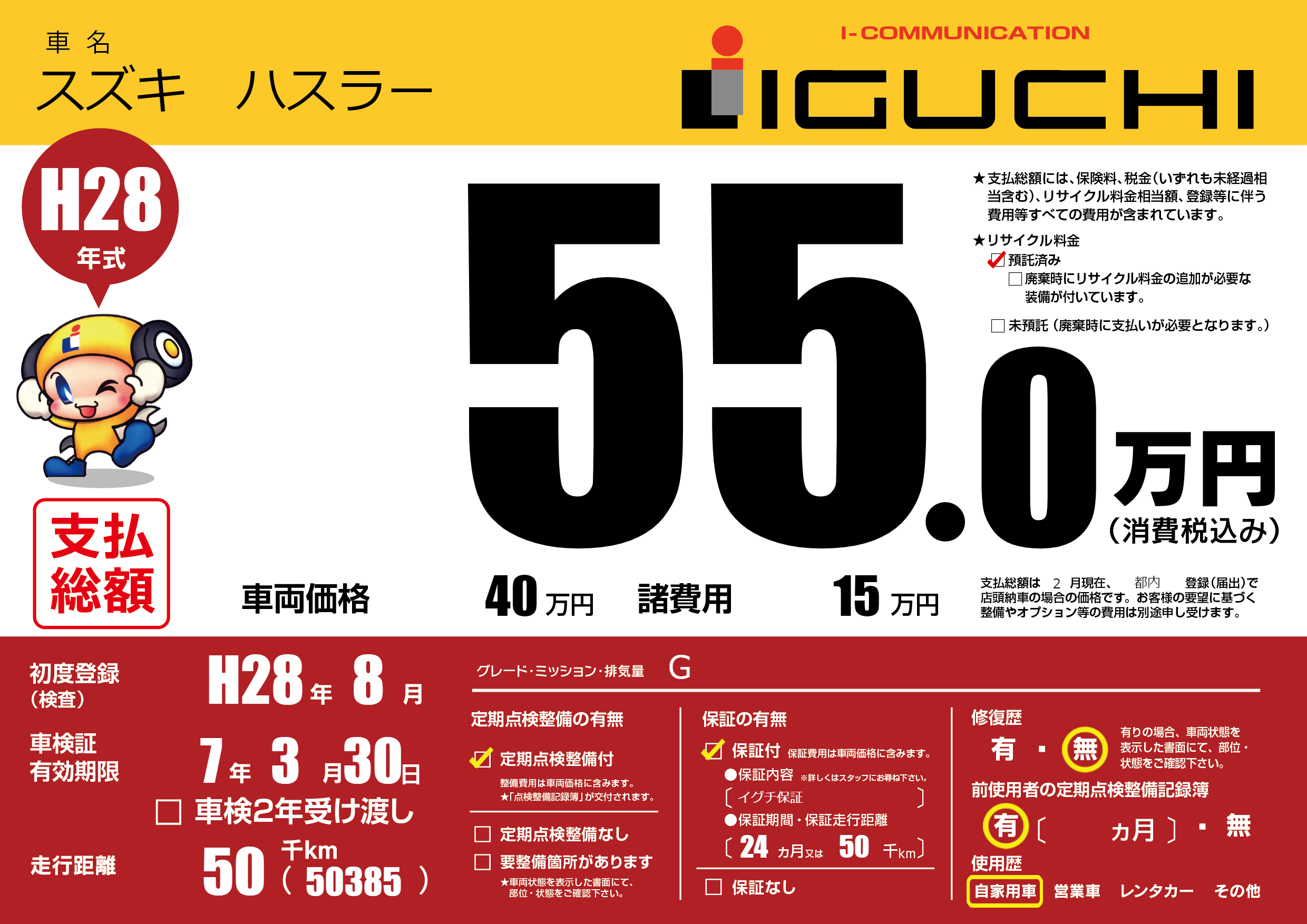 保証付き 保証内容(イグチ保証) 24ヶ月または(50)千kmまで |