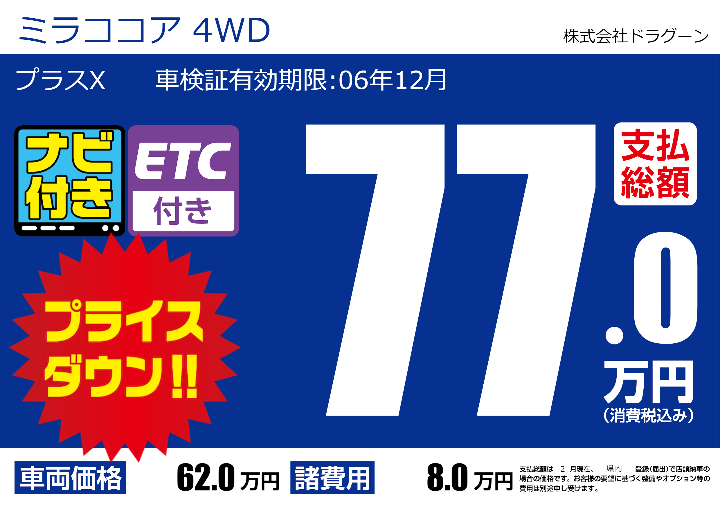 | 車名 | ミラココア 4WD | グレード ミッション 排気量 |