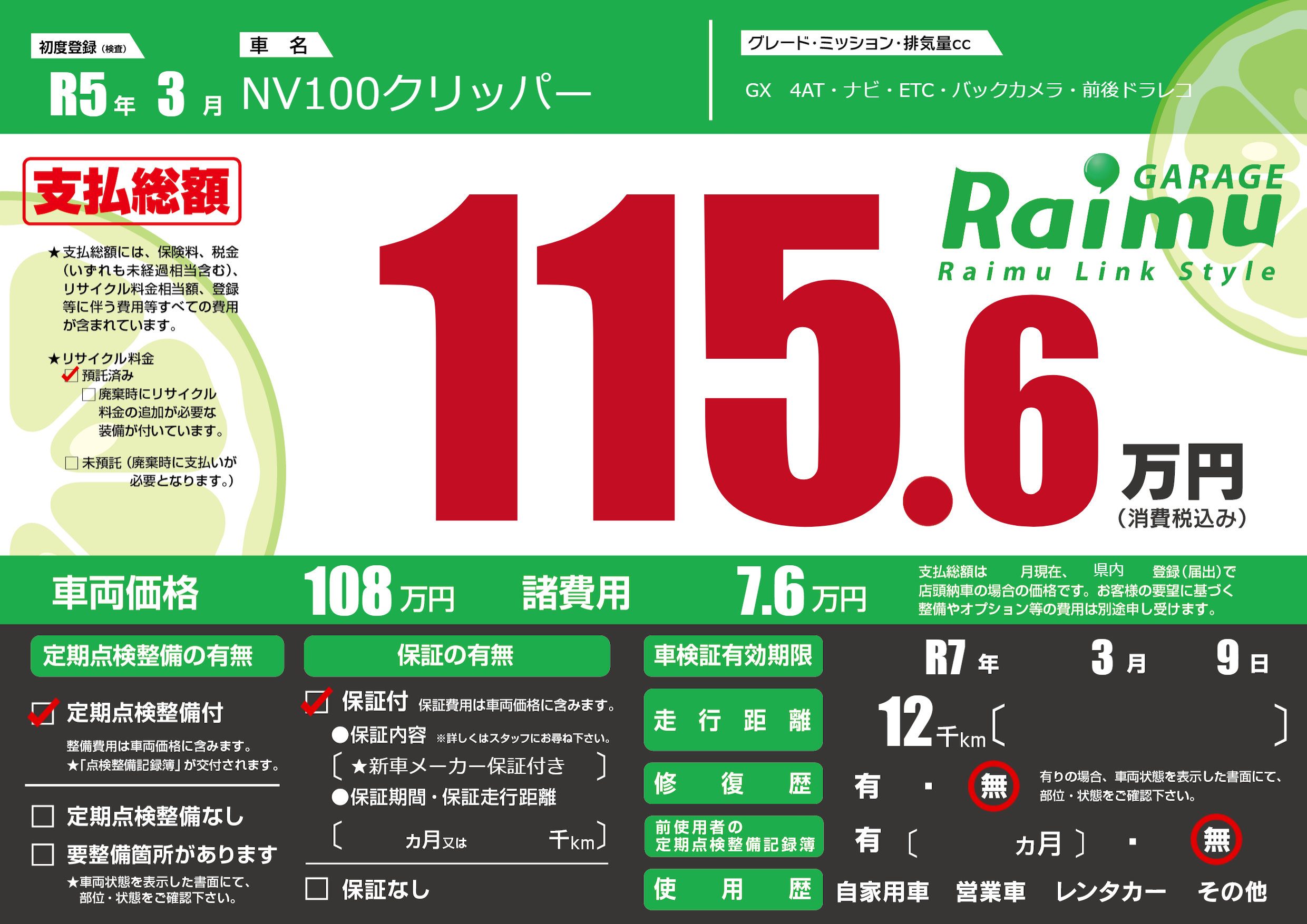 なし | 車検制限 | R7年3月9月 |