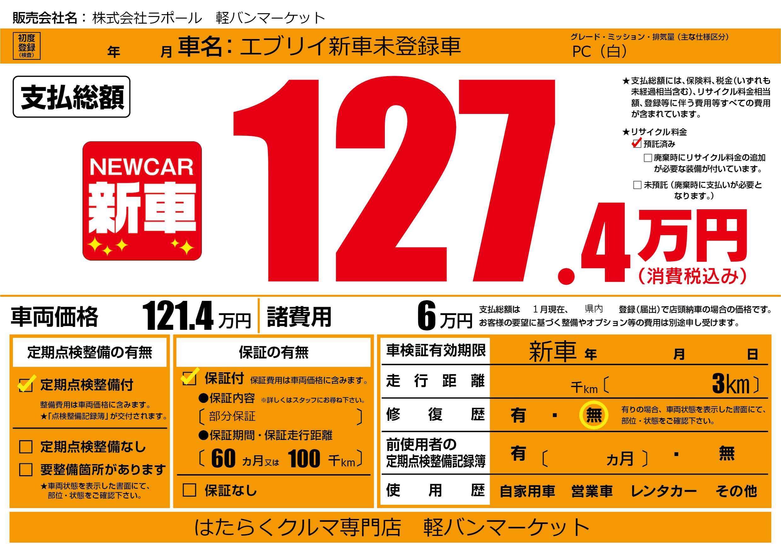 | 車名 | エブリイ新車未登録車 | グレード ミッション 排気量 |