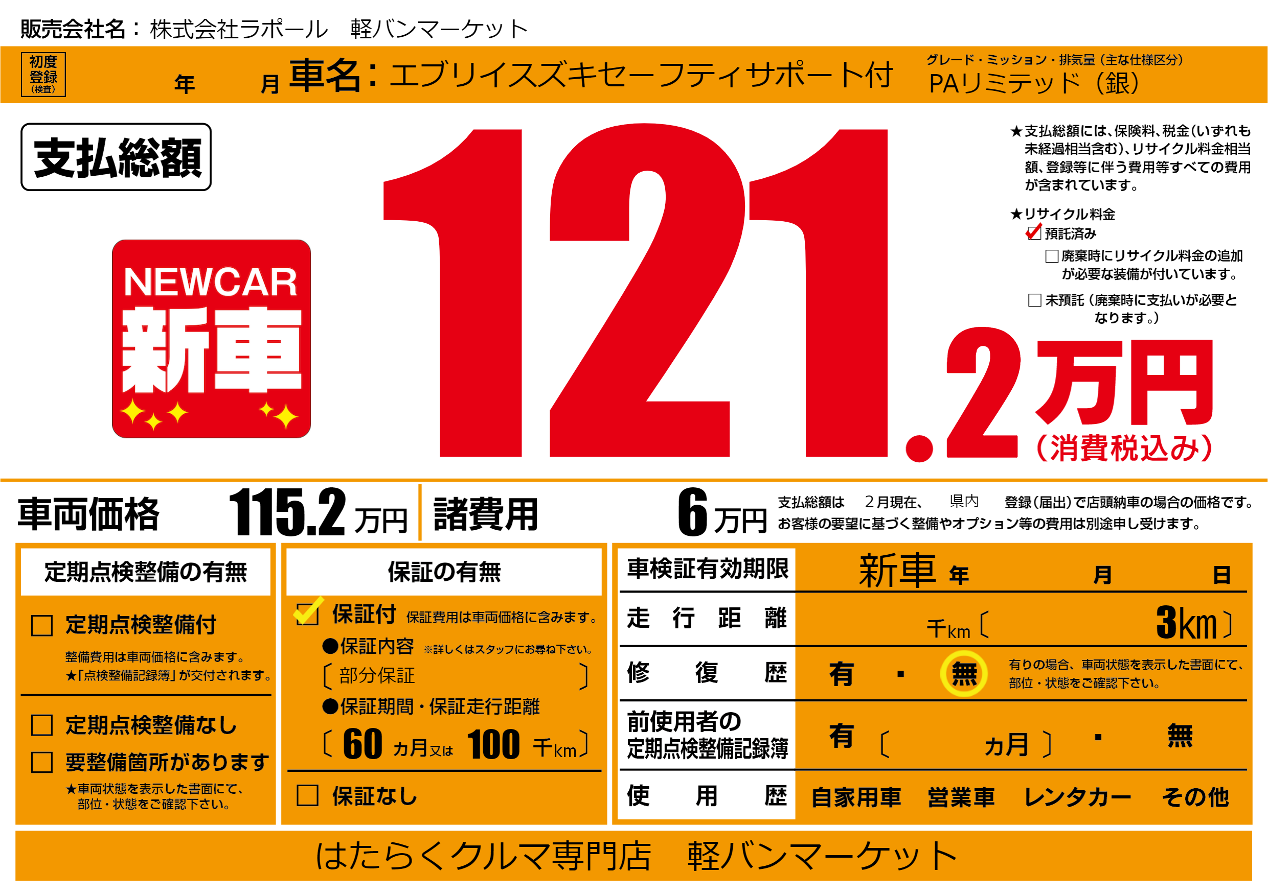 | 車名 | エブリイスズキセーフティサポート付 | グレード ミッション 排気量 |