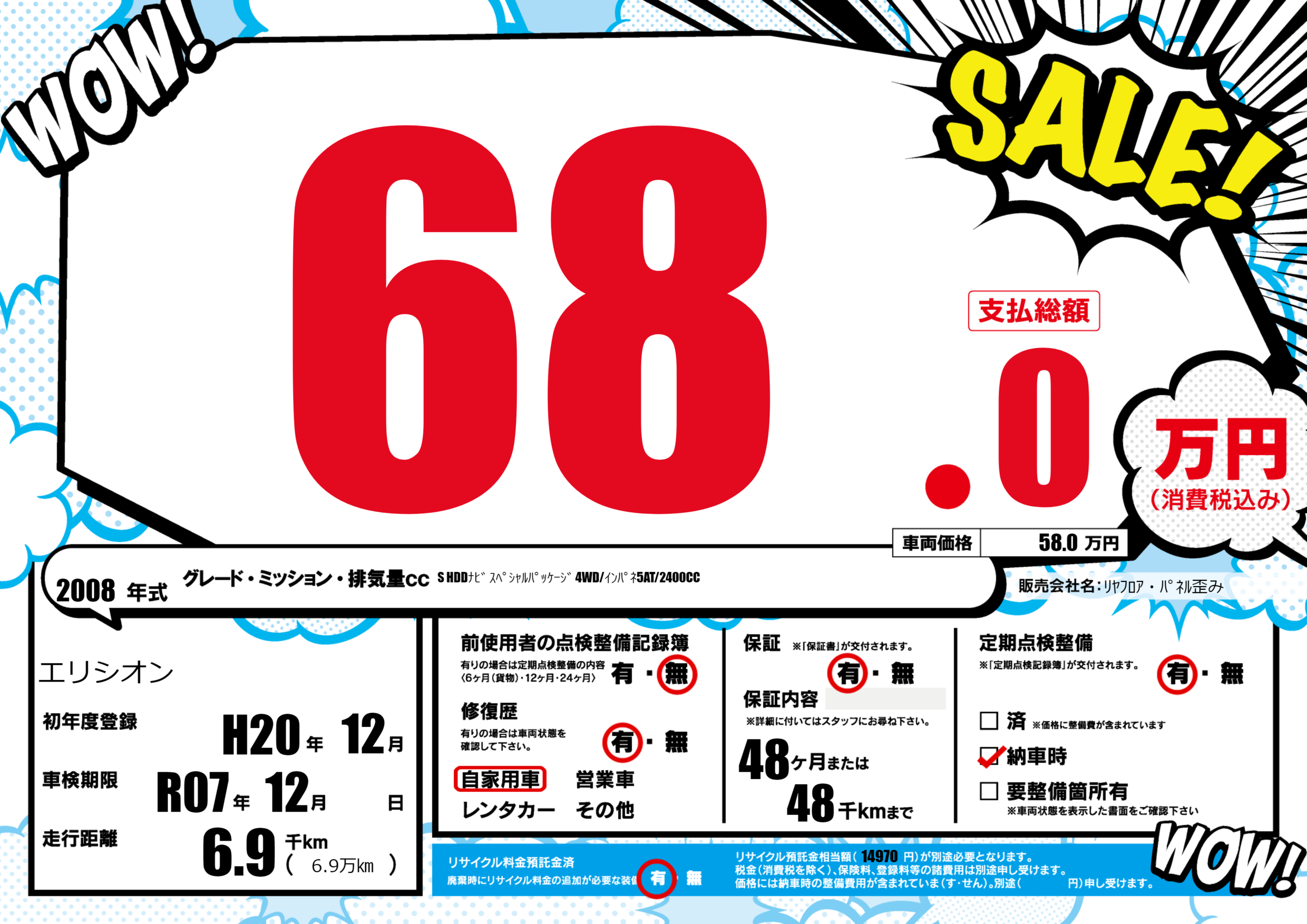 | 走行キロ | 0.6万km | 初年度登録 | H20年12月 |