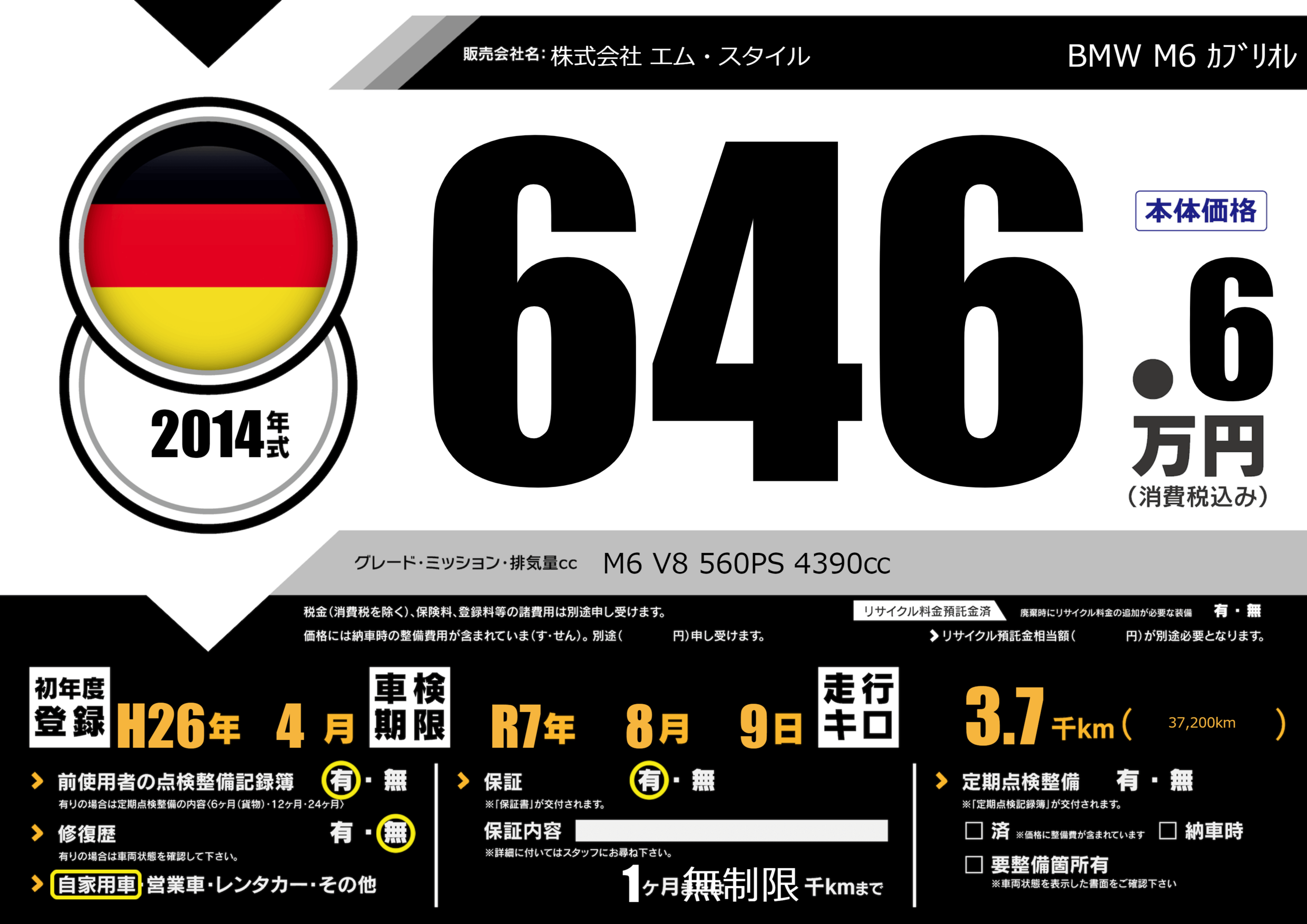 | 車名 | BMW M6 カブリオレ | グレード ミッション 排気量 |