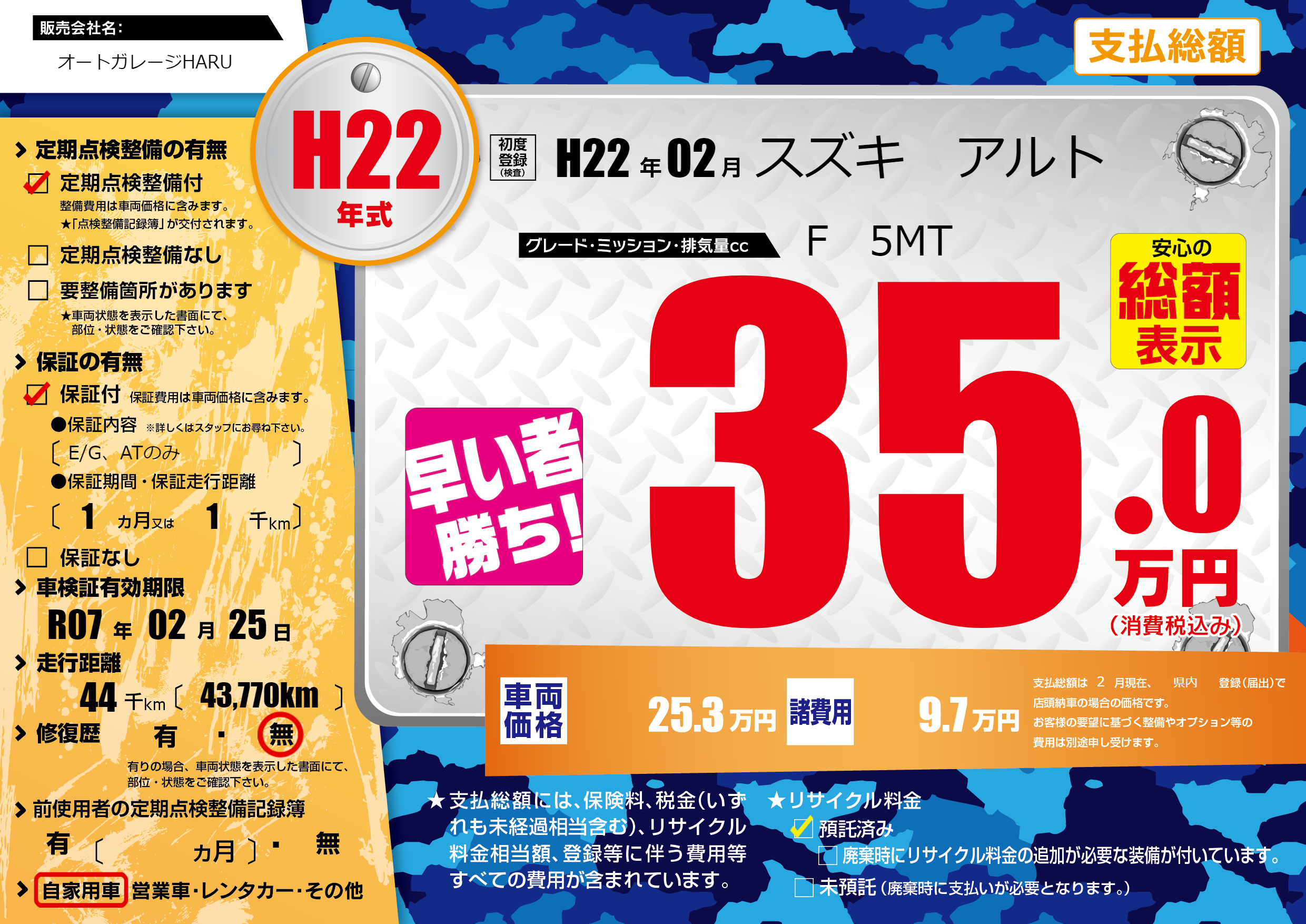| 車名 | スズキ アルト | グレード ミッション 排気量 |