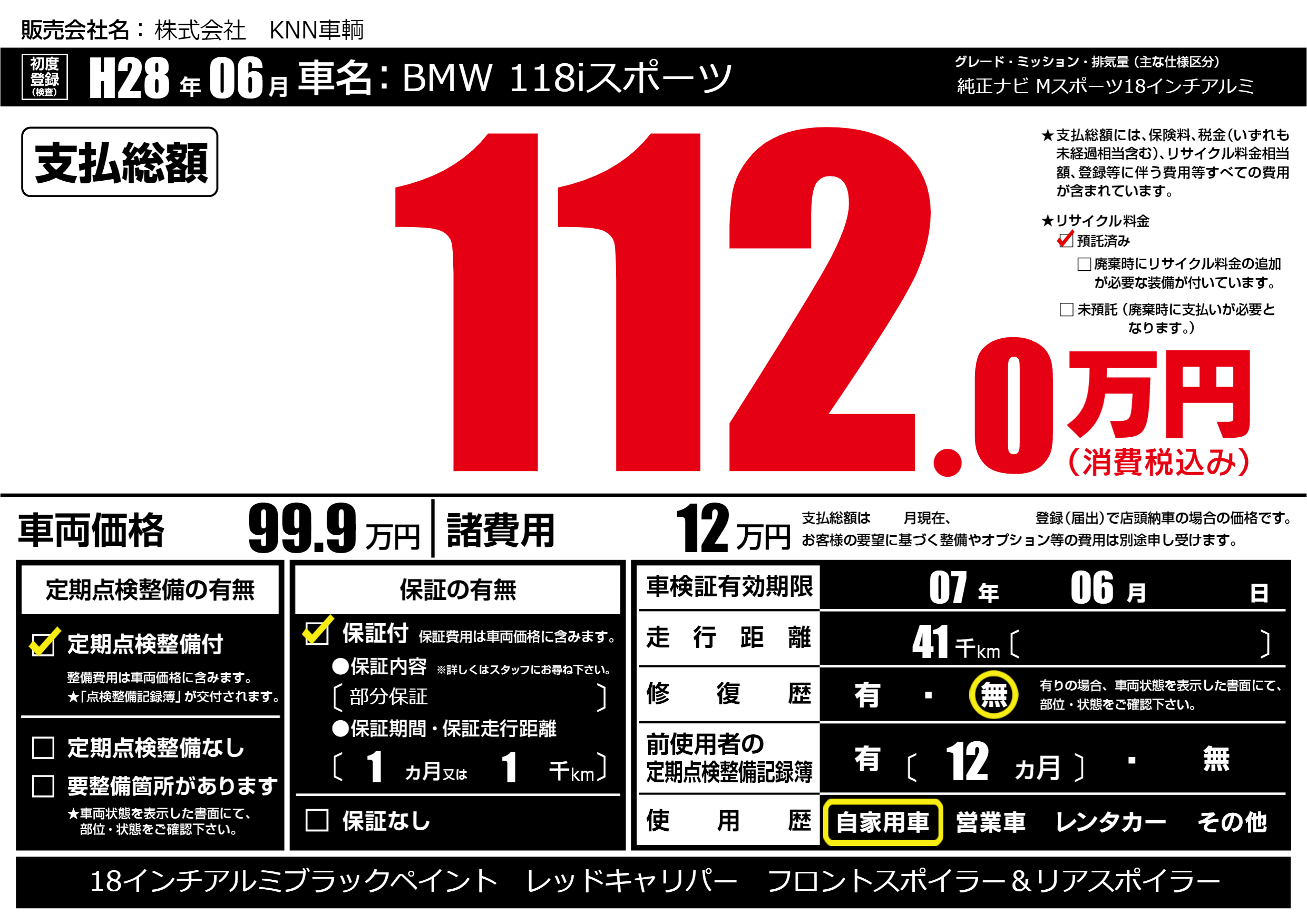 | 車名 | BMW 118iスポーツ | グレード ミッション 排気量 |