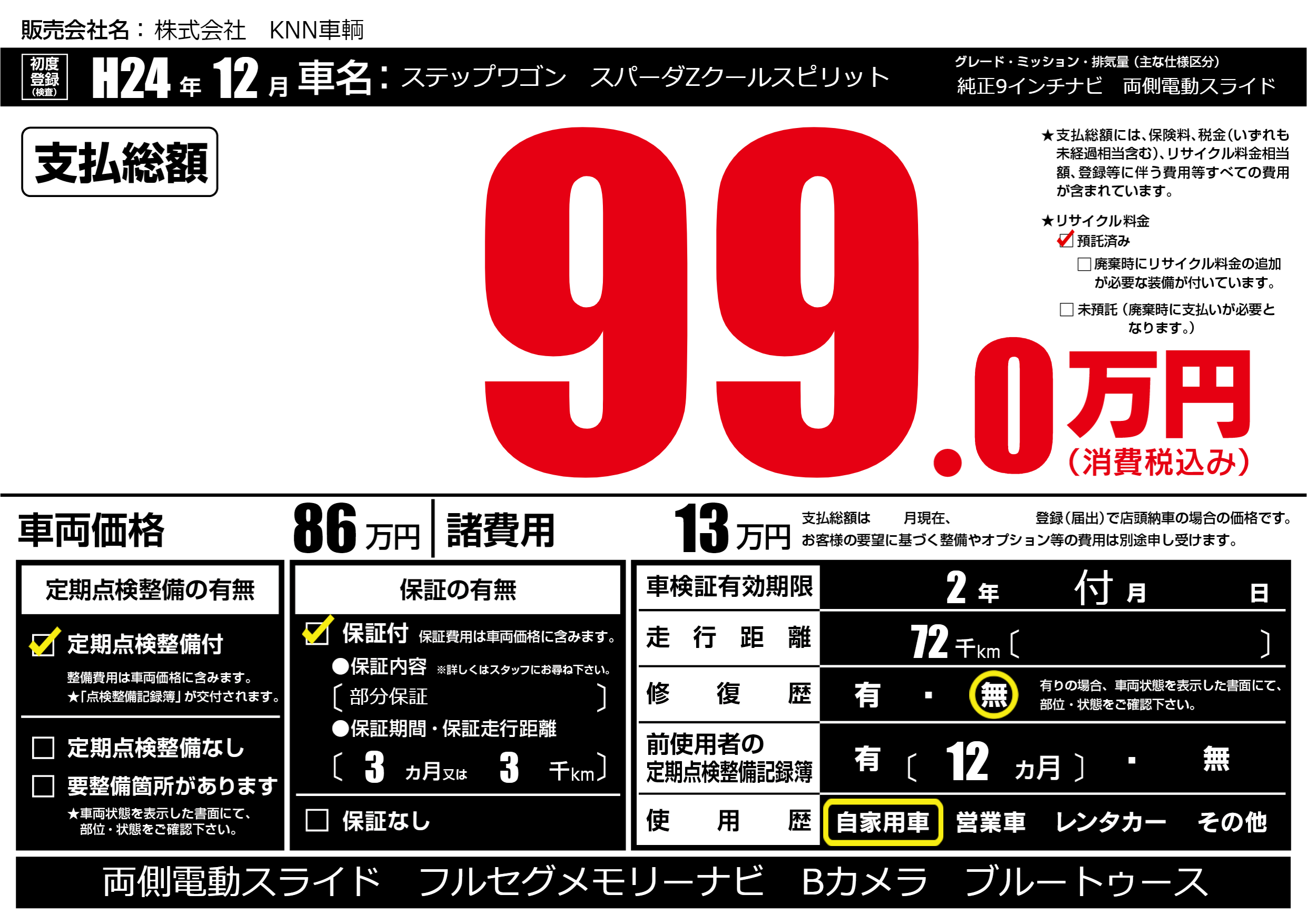 | 走行キロ | 7.2万km | 初年度登録 | H24年12月 |