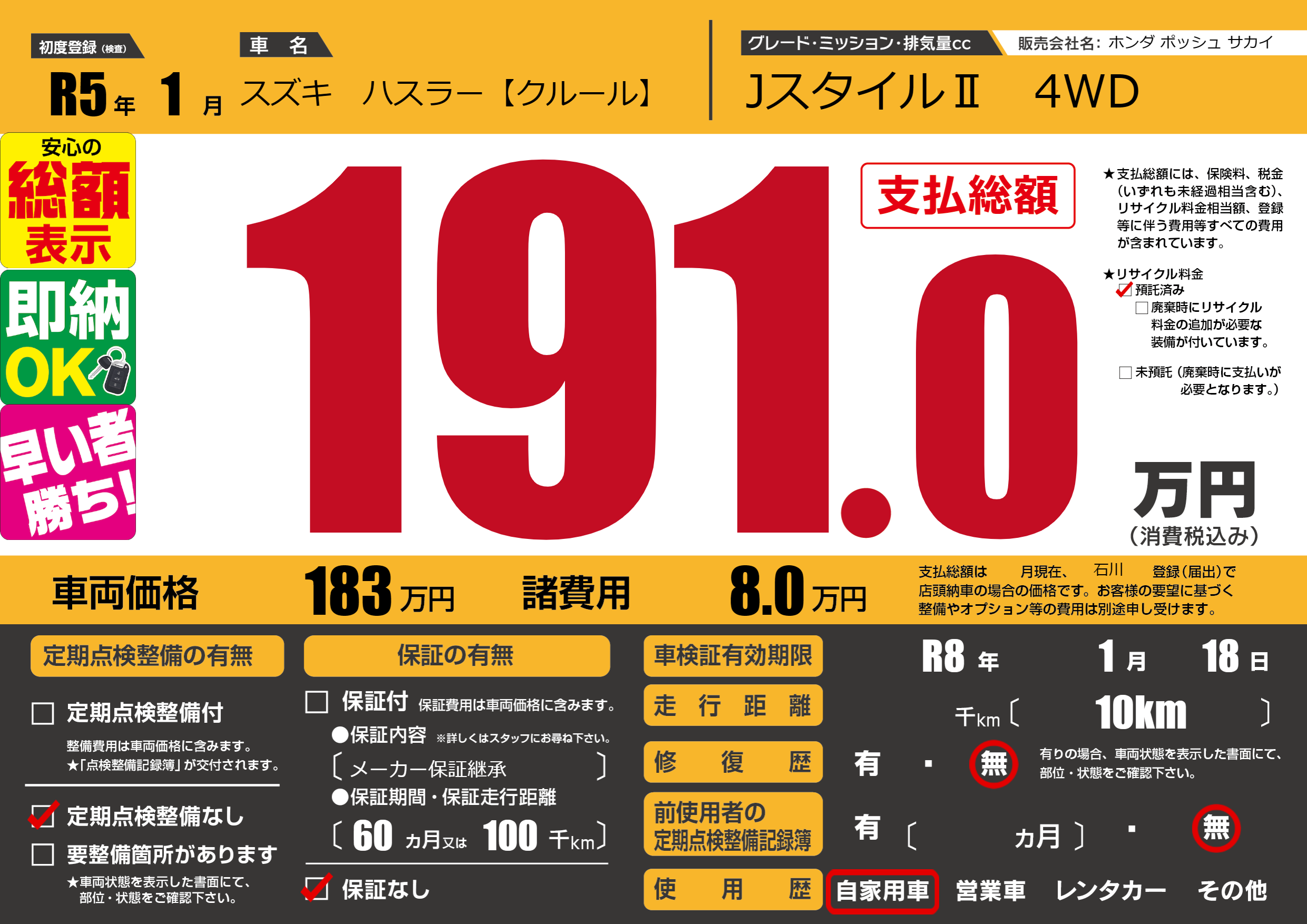保証なし 保証内容(メーカー保証継承) 60ヶ月または(100)千kmまで |