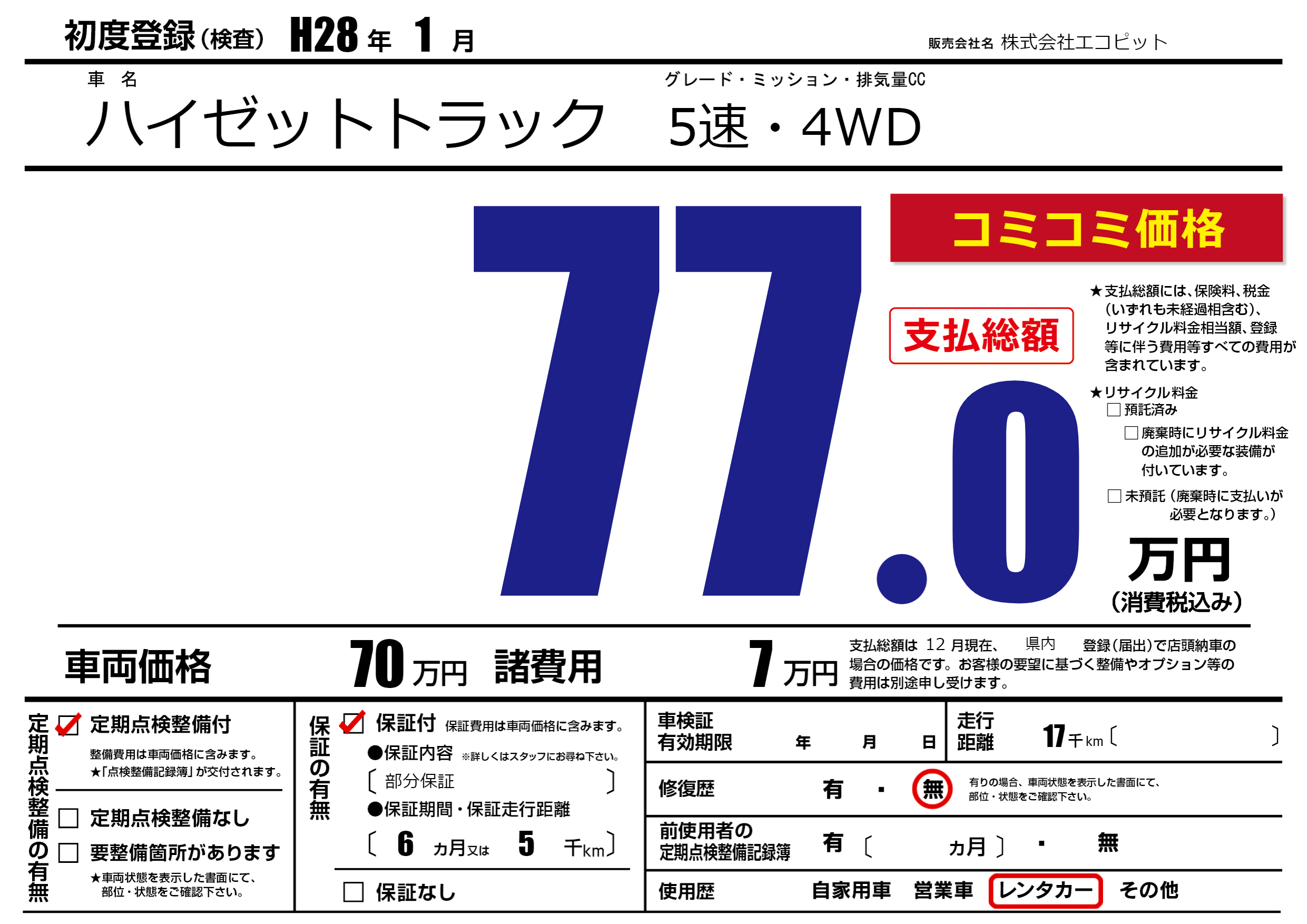 保証付き 保証内容(部分保証) 6ヶ月または(5)千kmまで |