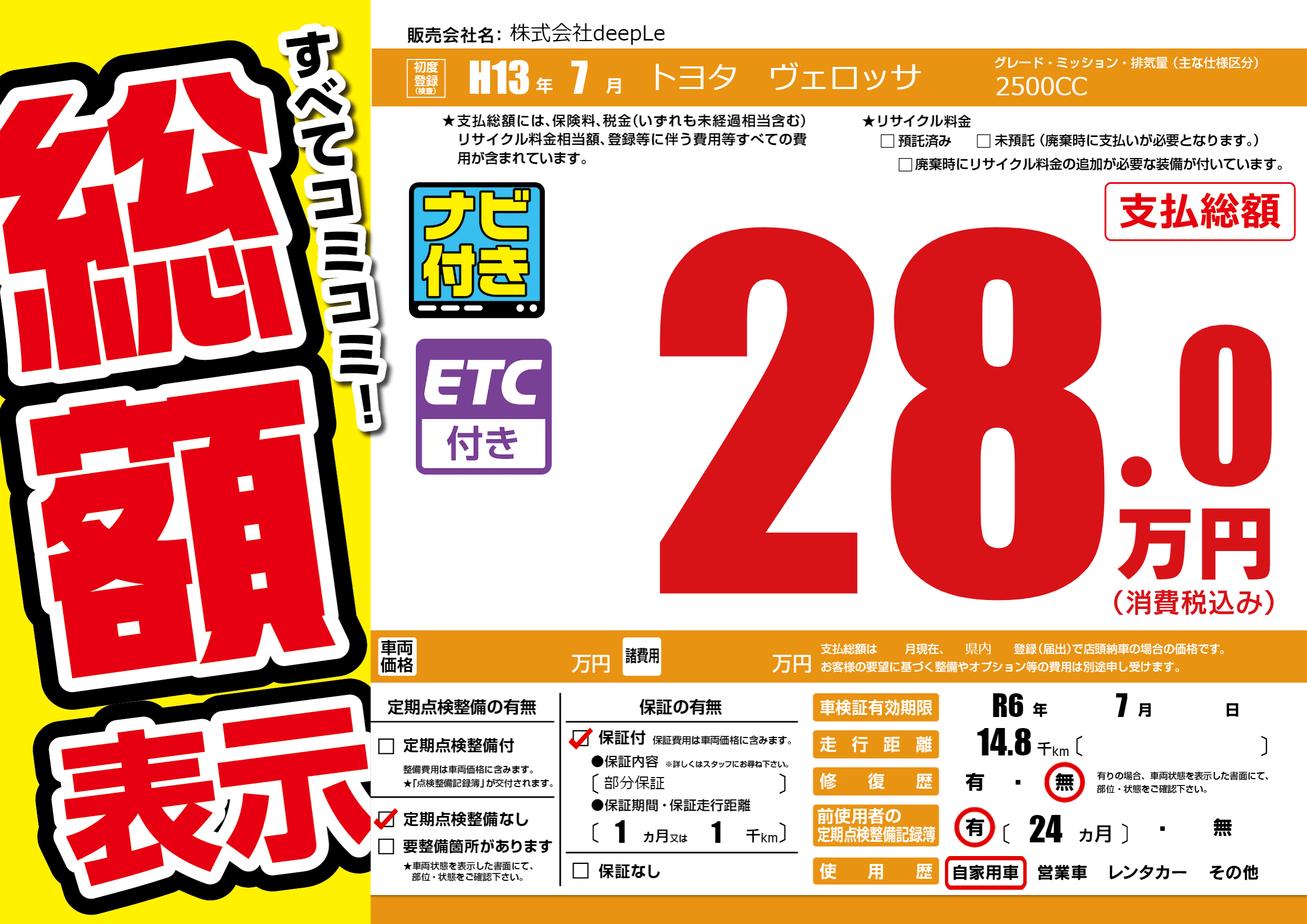 | 走行キロ | 1.4万km | 初年度登録 | H13年7月 |