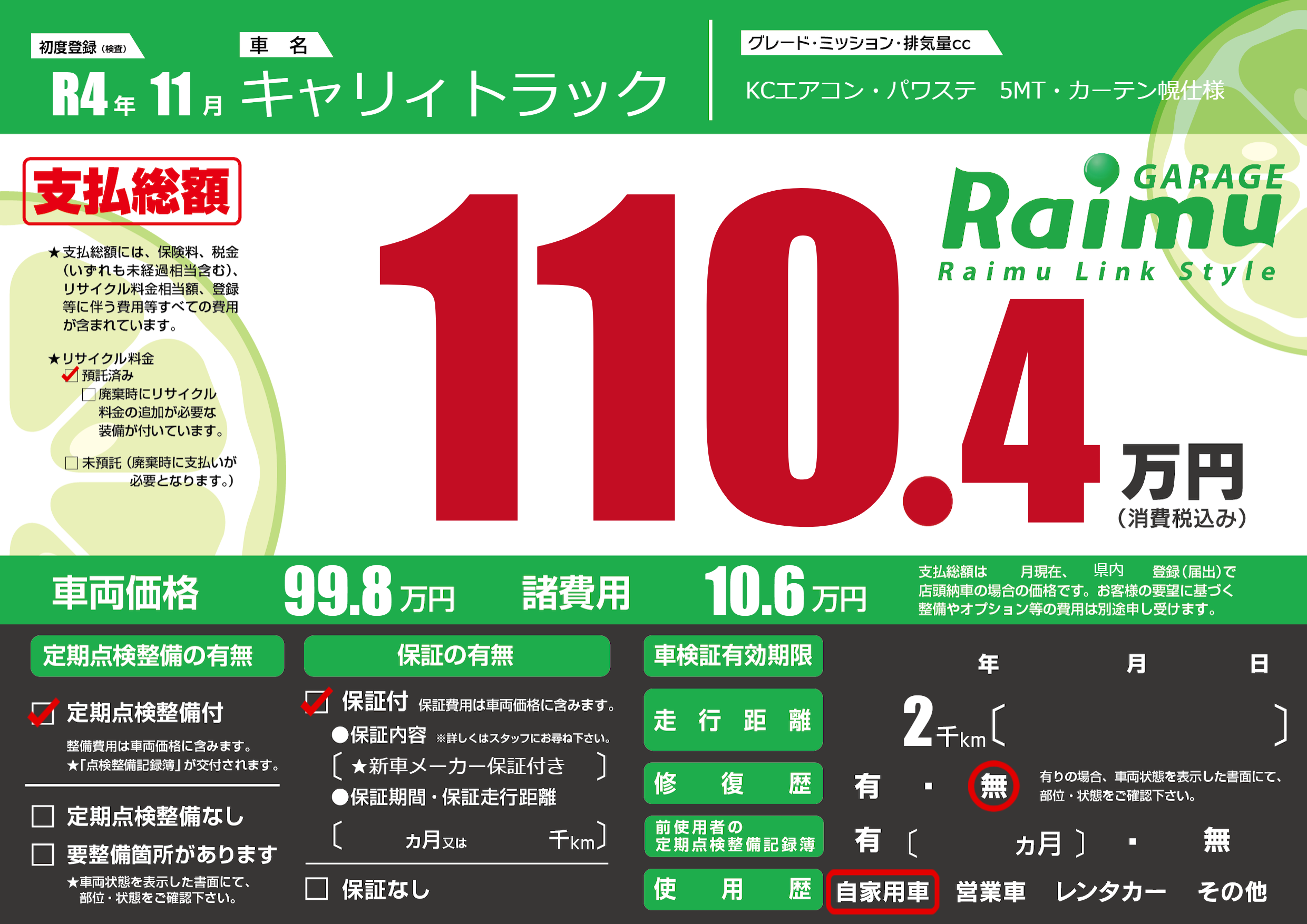 | 車名 | キャリィトラック | グレード ミッション 排気量 |