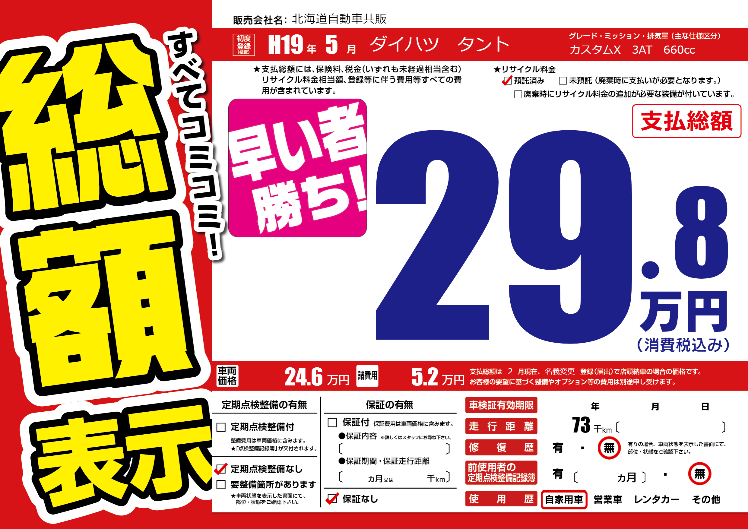 | 車名 | ダイハツ タント | グレード ミッション 排気量 |