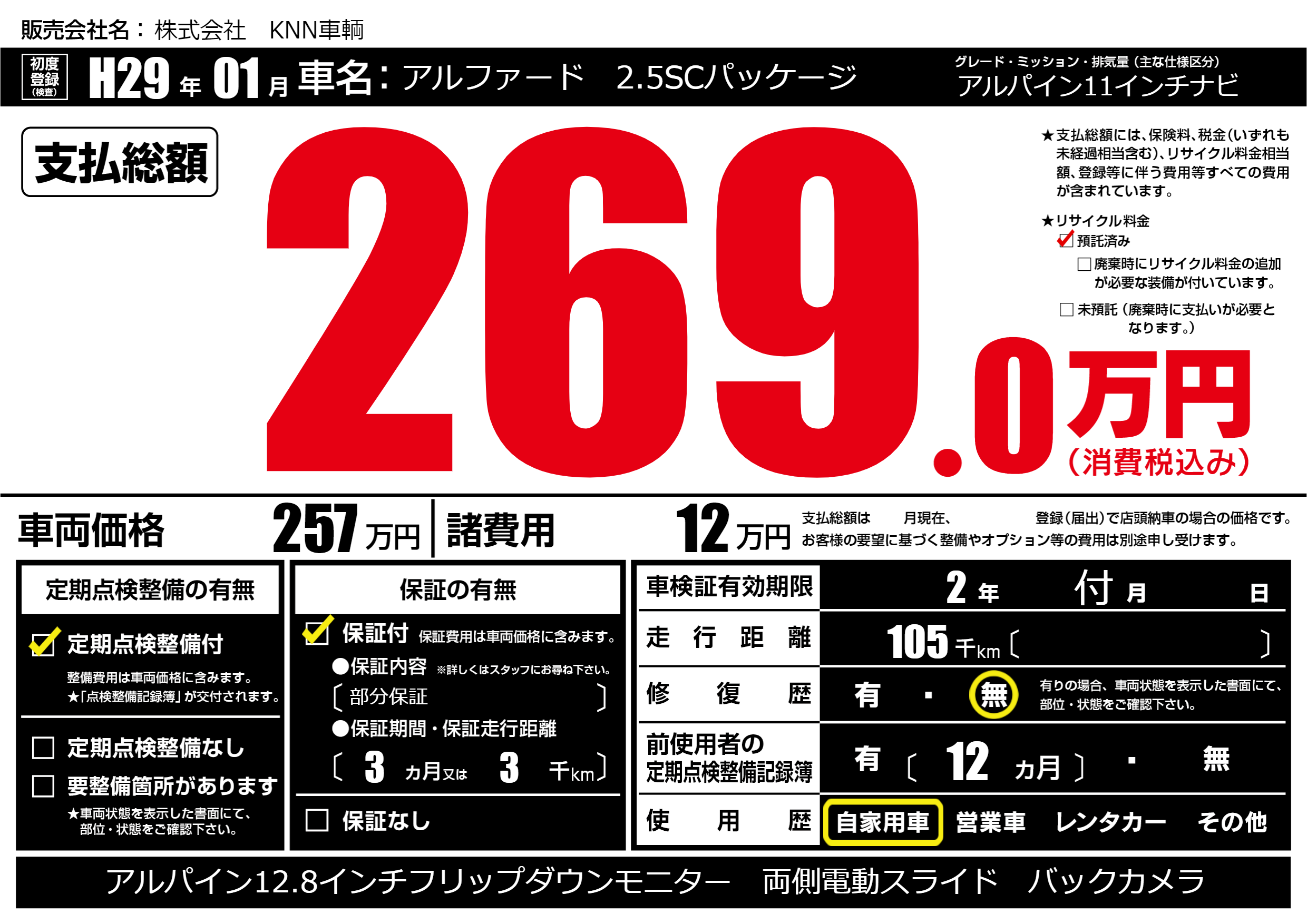 | 車名 | アルファード 2.5SCパッケージ | グレード ミッション 排気量 |