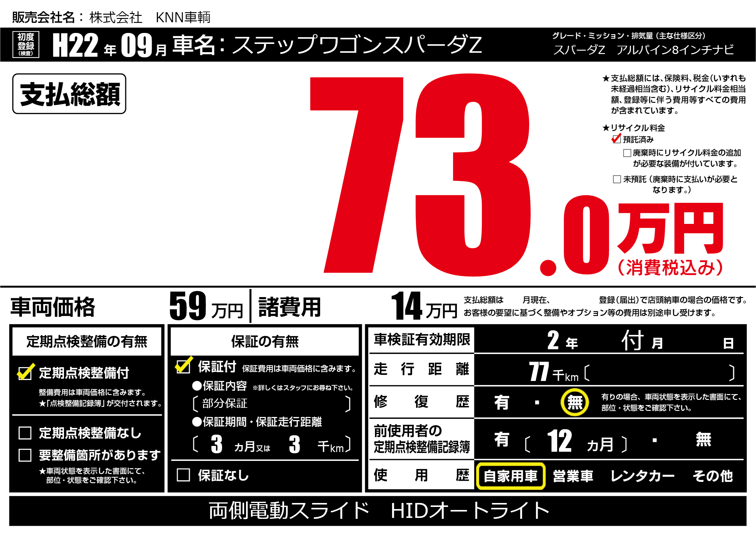 | 走行キロ | 7.7万km | 初年度登録 | H22年09月 |