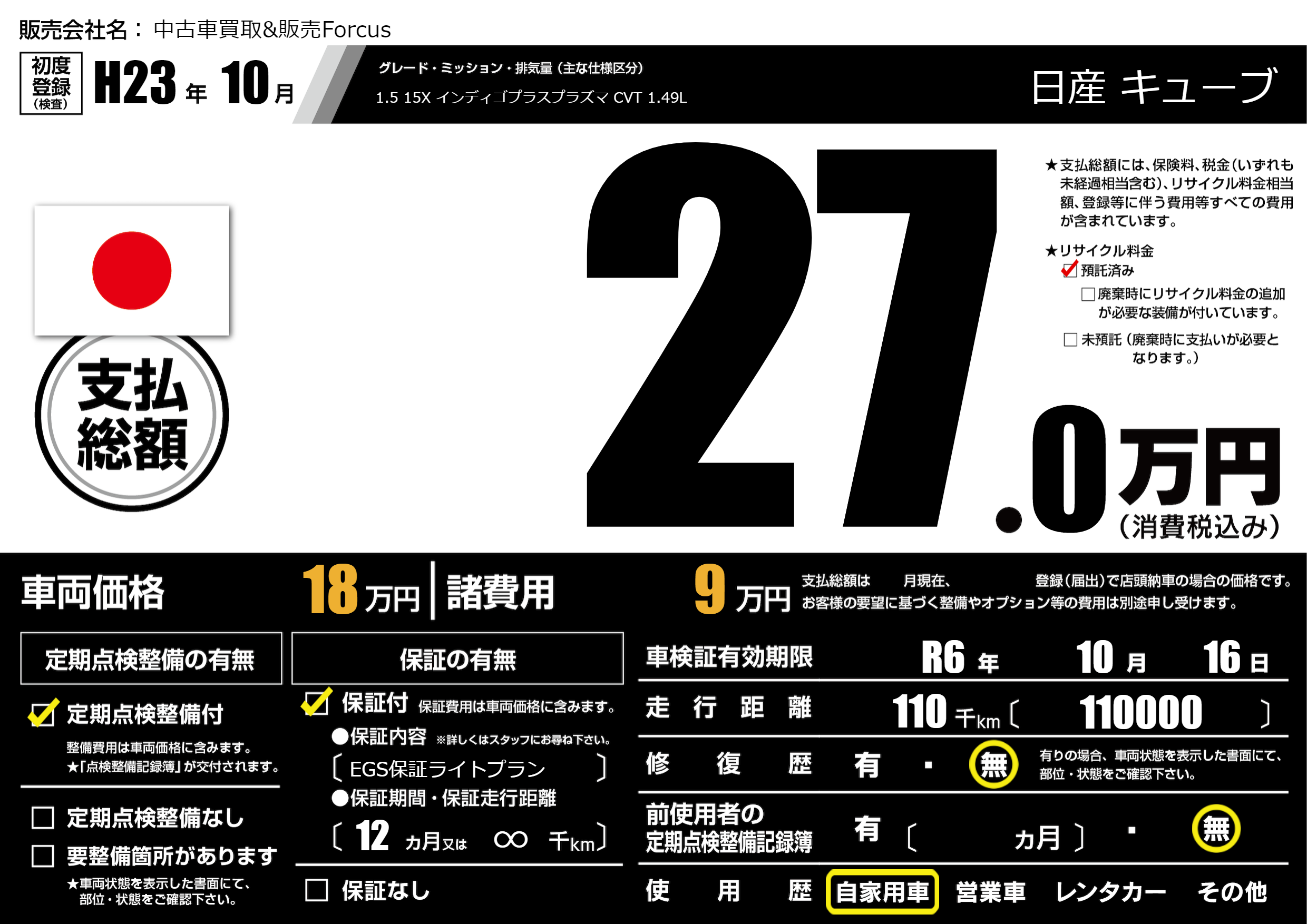 | 車名 | 日産 キューブ | グレード ミッション 排気量 |
