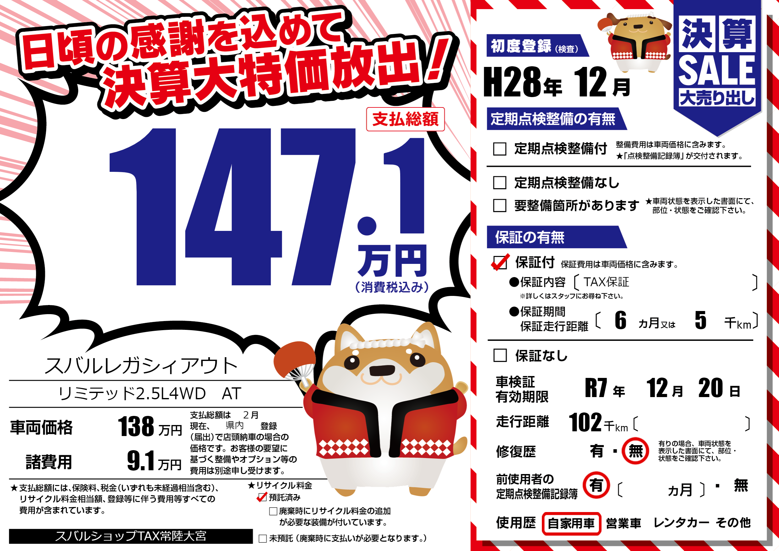 保証付き 保証内容(TAX保証) 6ヶ月または(5)千kmまで |