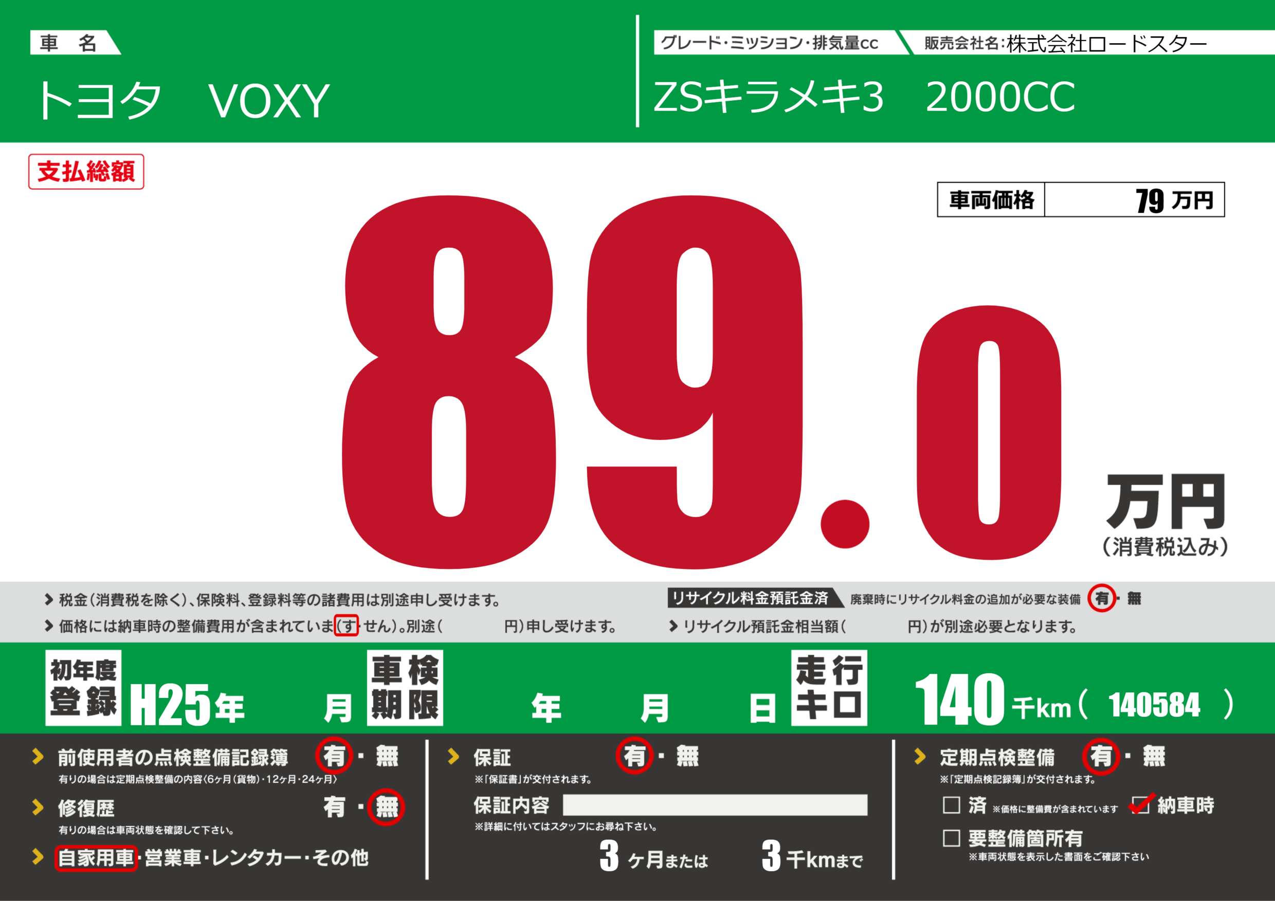 | 車名 | トヨタ VOXY | グレード ミッション 排気量 |