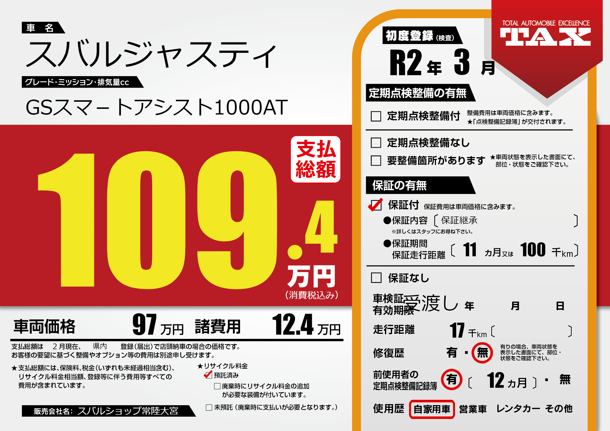 | 車名 | スバルジャスティ | グレード ミッション 排気量 |