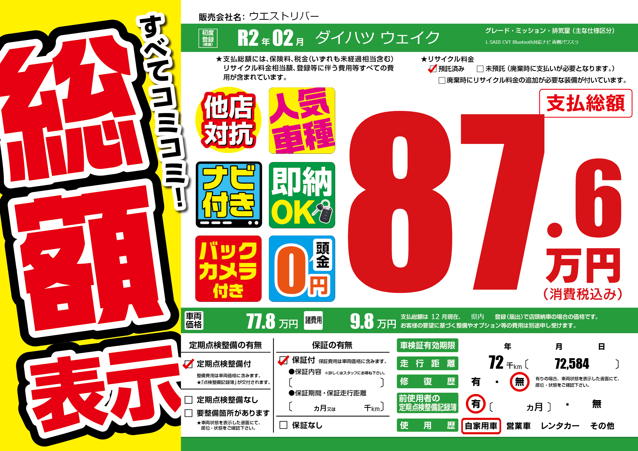 | 車名 | ダイハツ ウェイク | グレード ミッション 排気量 |