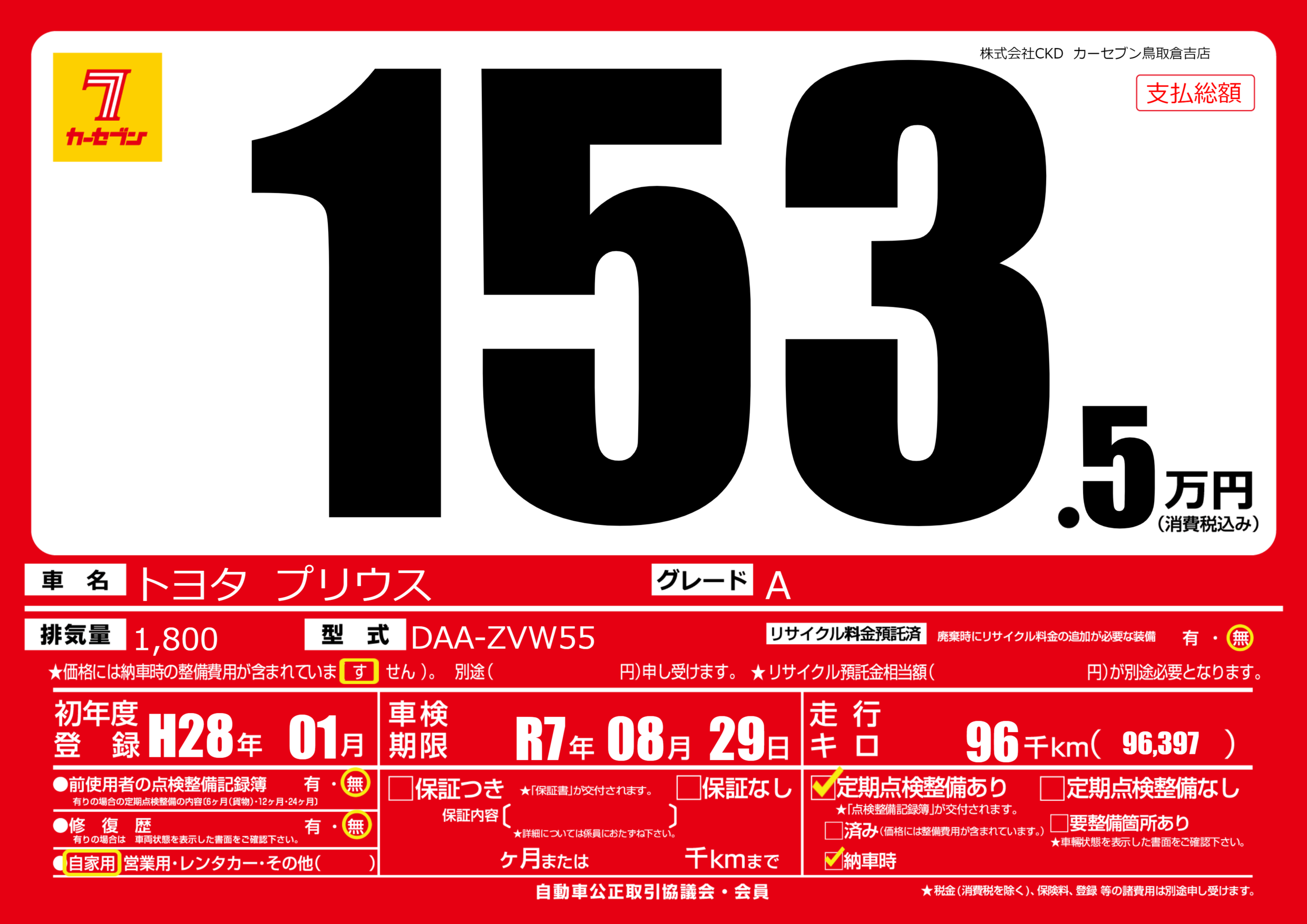 | 車名 | トヨタ プリウス | グレード ミッション 排気量 |