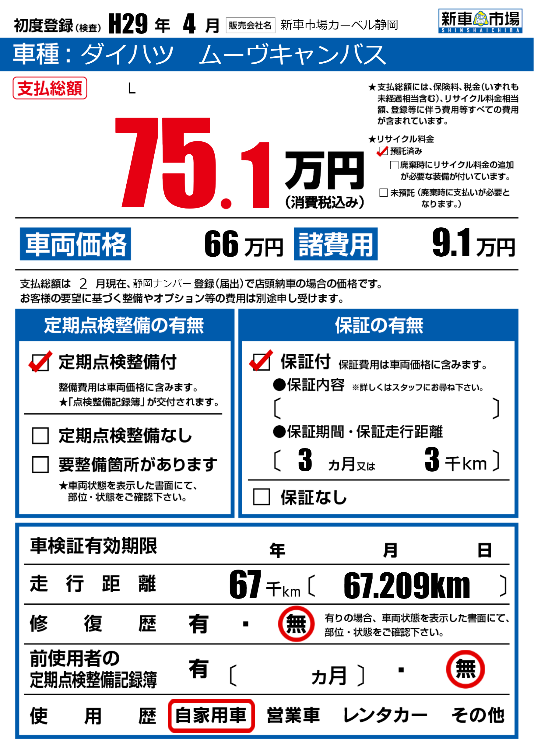 | 走行キロ | 6.7万km | 初年度登録 | H29年4月 |