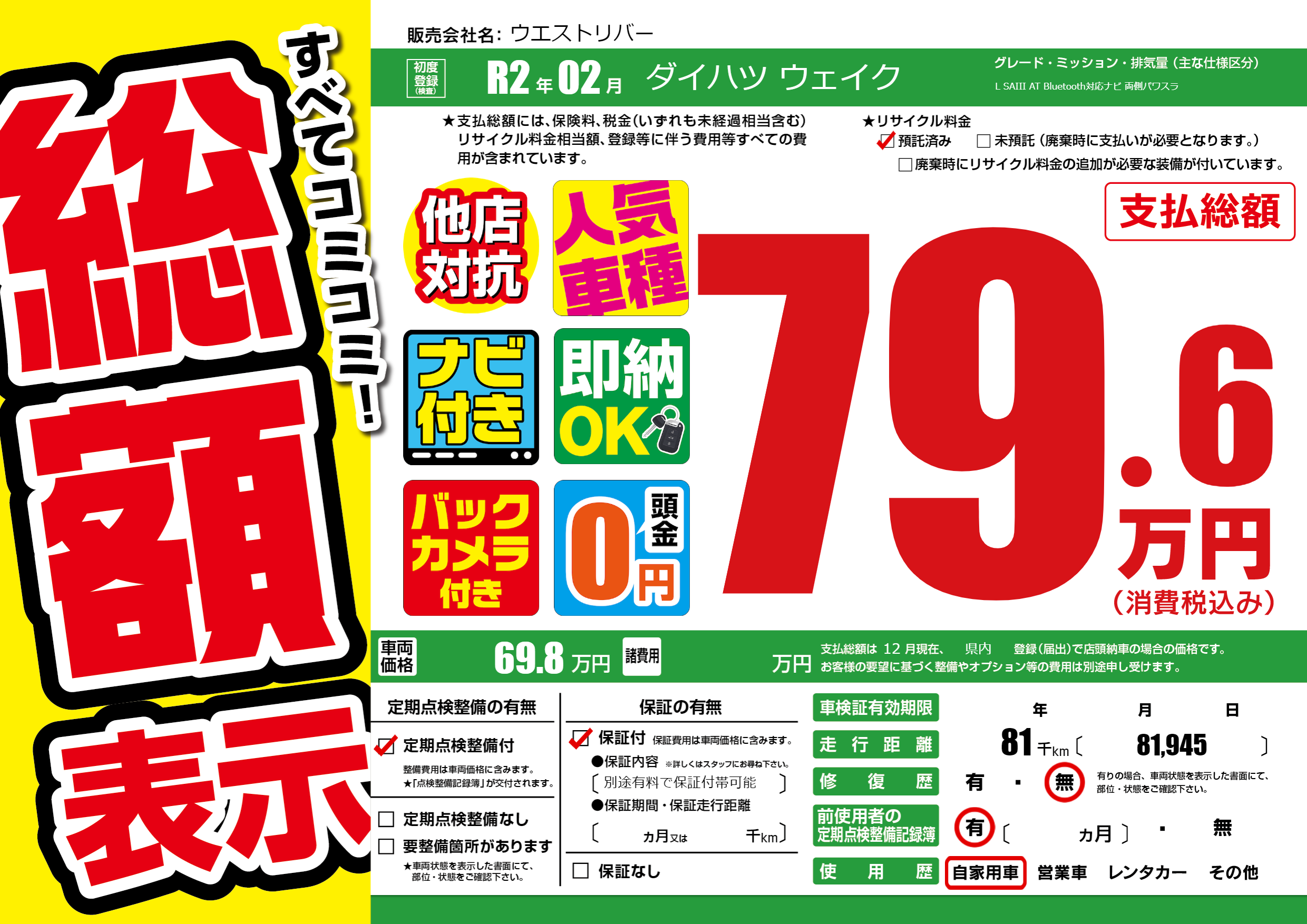 | 車名 | ダイハツ ウェイク | グレード ミッション 排気量 |