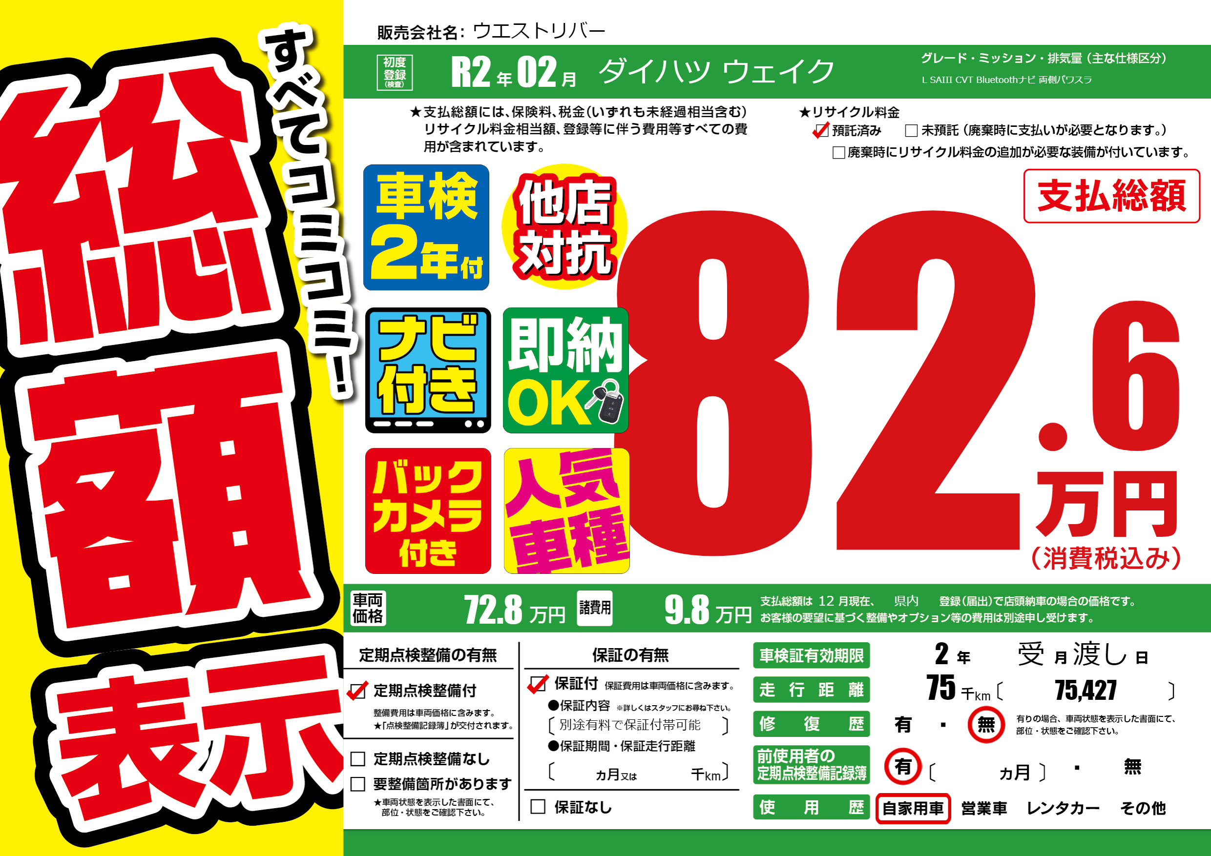 | 車名 | ダイハツ ウェイク | グレード ミッション 排気量 |