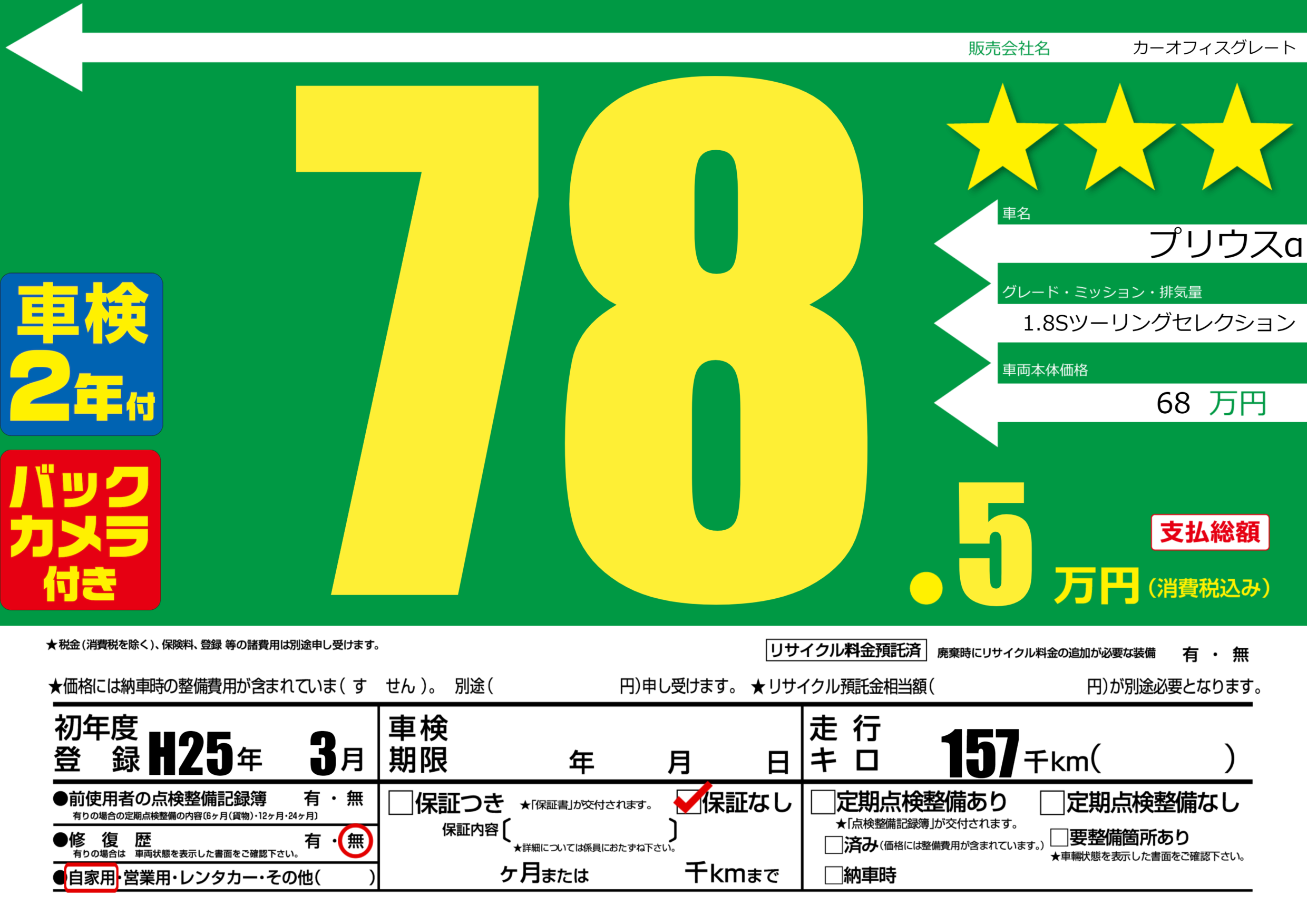 | 車名 | プリウスα | グレード ミッション 排気量 |